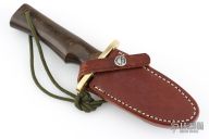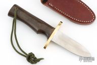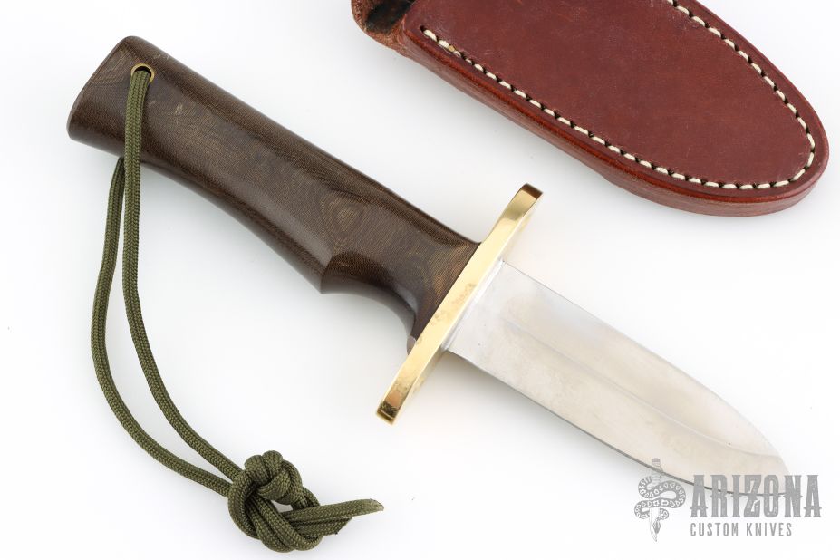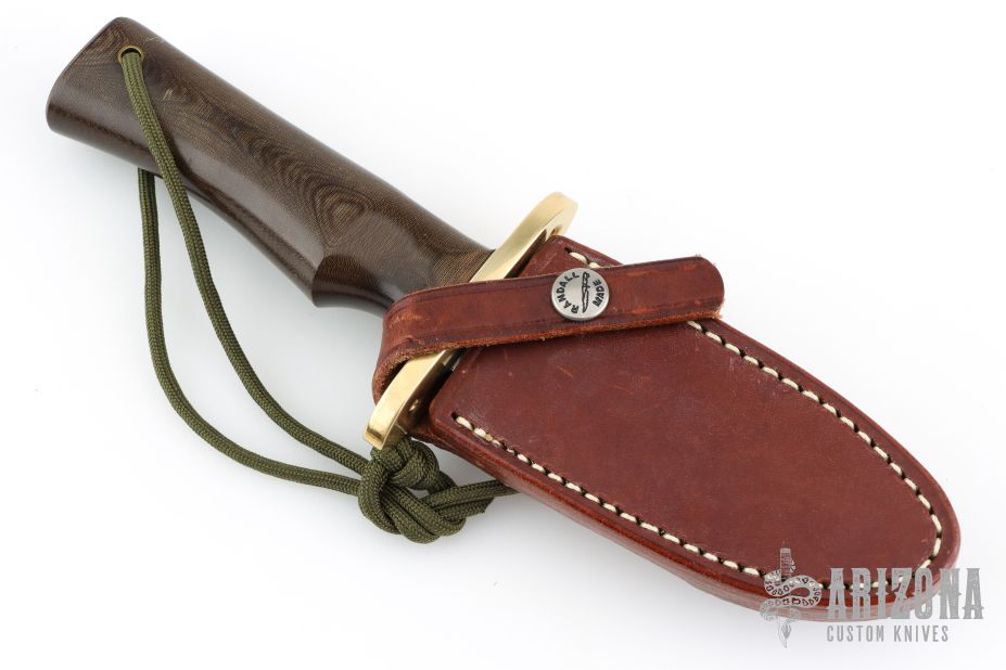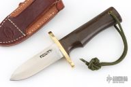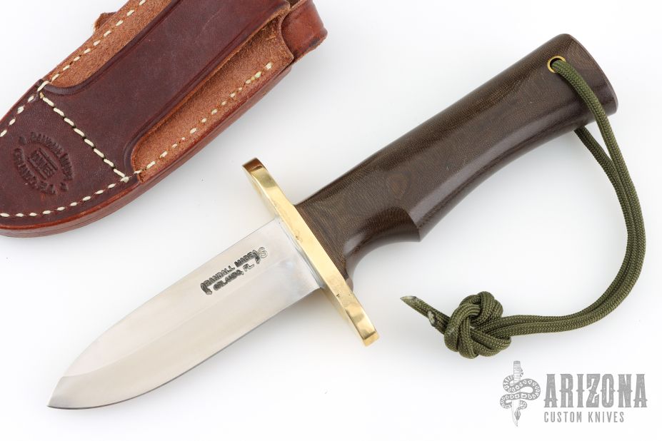 The Fireman Special is a non-catalog model by Randall Made Knives with an extra-heavy beveled blade with .222" blade stock and 1.139" blade depth, full tang cosntruction. This knife has a 4" stainless steel blade, Model 18 style brass double guard, and a green linen micarta single finger grip handle. Comes with a high ride brown leather sheath. Excellent condition.