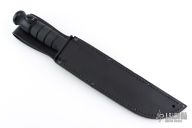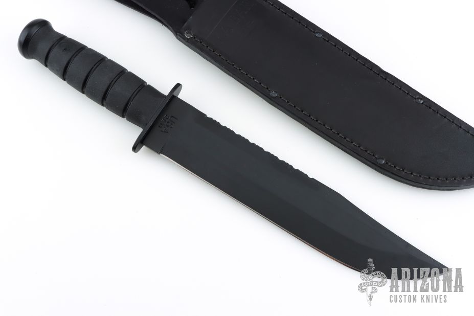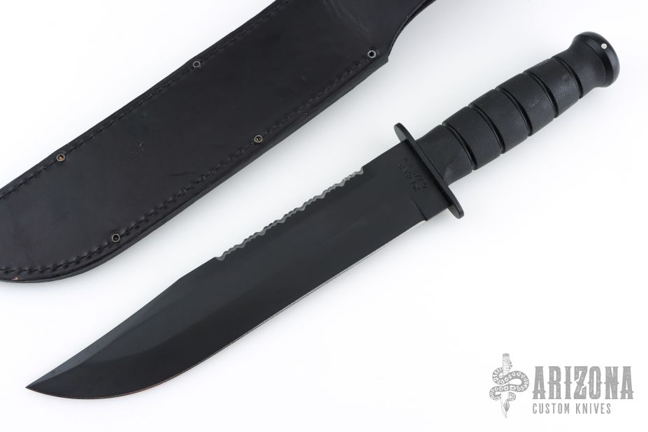 Designed in cooperation with the highly-trained folks at S.E.I.G.E. (Strategic Edge Impact Global Enterprise) of Webster, NY, the high-carbon, non-reflective black blade of the Big Brother is epoxy powder-coated and tests prove the finish is more durable than ever. The classic oval shape of the original KA-BAR remains and has been modernized with a material nearly impervious to sweat, chemicals, water and wear - Kraton G®. Featuring a serrated top and straight bottom, the "Big Brother" is a perfect addition to the Kraton G® line. Leather sheath included.