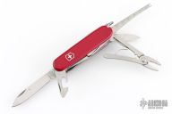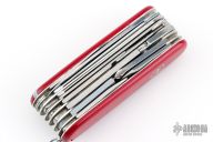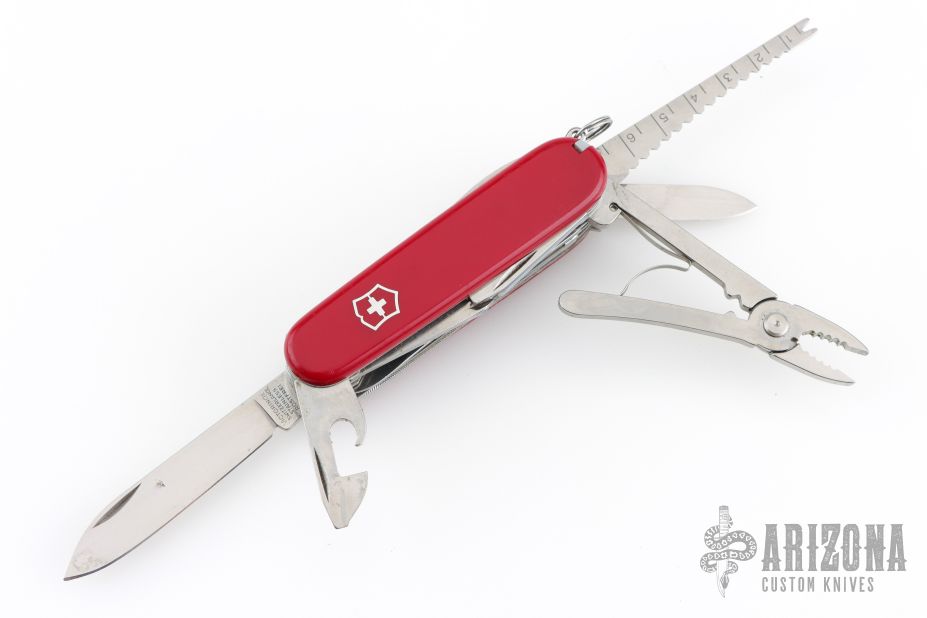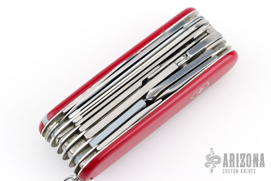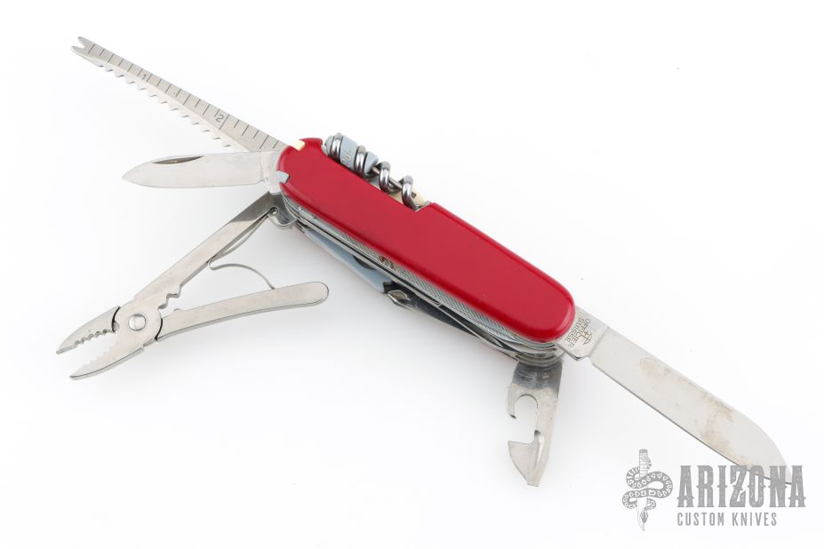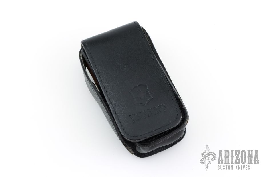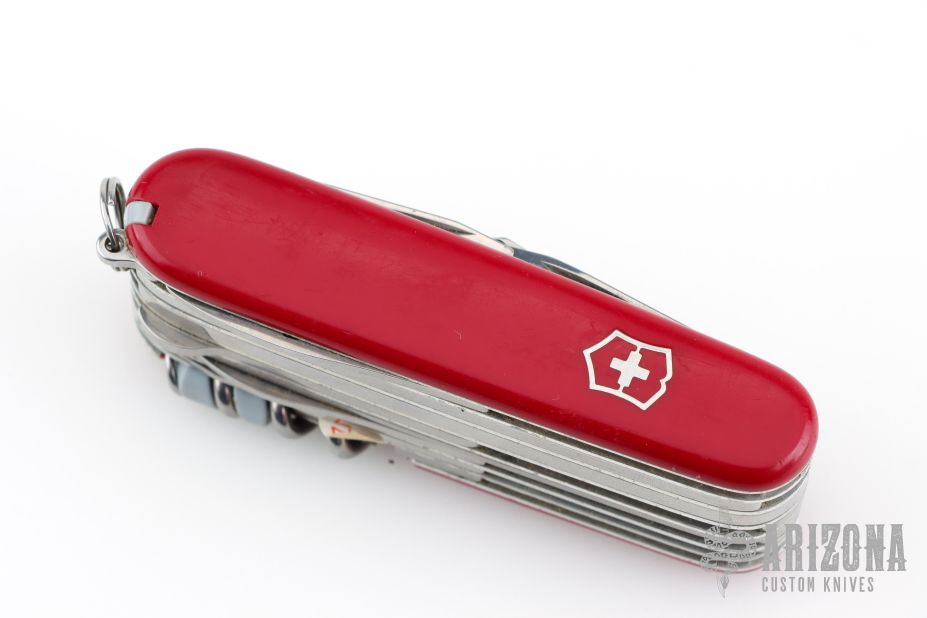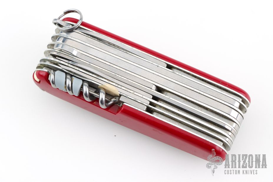 Victorinox SwissChamp Red. Comes with black leather sheath, with ruler, compass, safety pins, sharpening stone, pencil and papers. Has some scratches, Has been used and carried, otherwise good condition.
