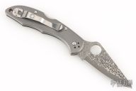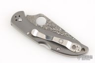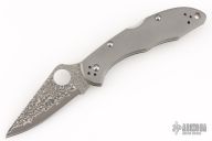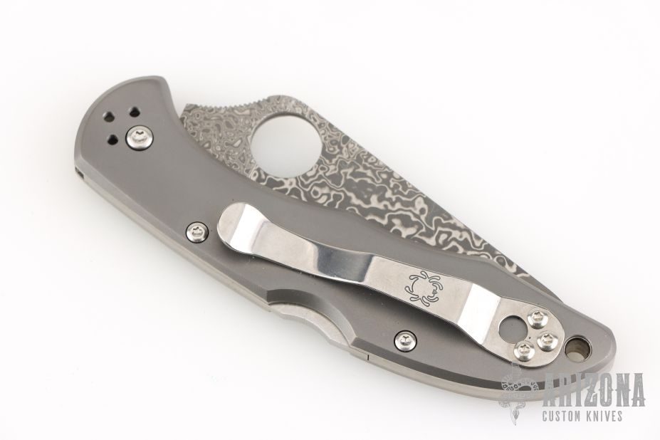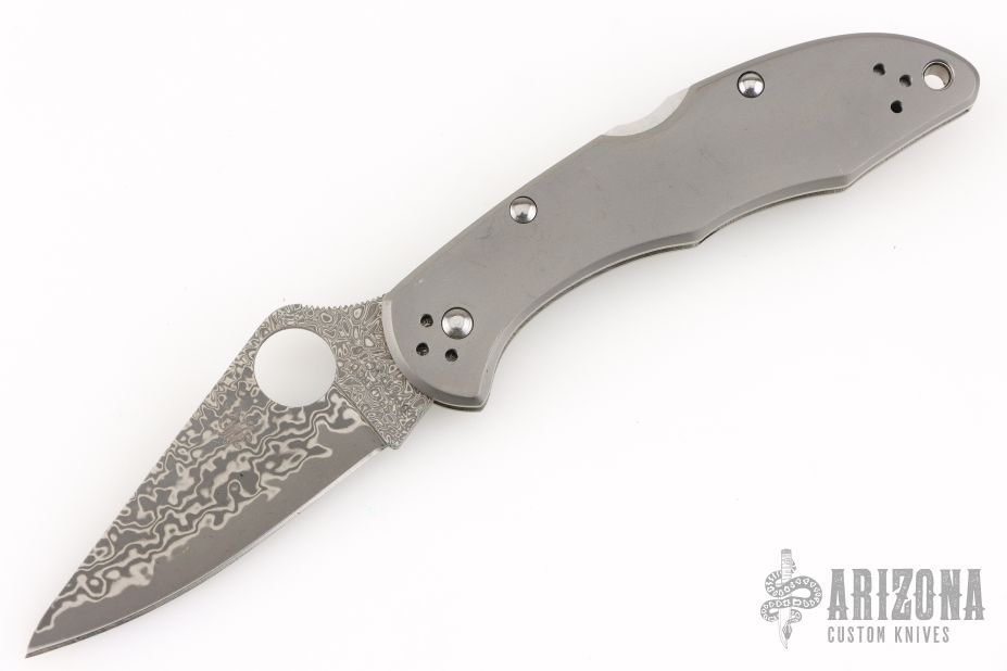 This Delica Lockback Folder from Spyderco has a San Mai Damascus VG-10 core blade with thumbhole and notched thumb ramp. Handle is a titanium frame, stainless steel lock/ spacer, tip up stainless steel pocket clip. Has scuffs on the handle, otherwise good condition.