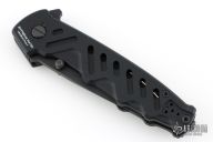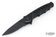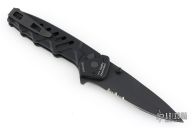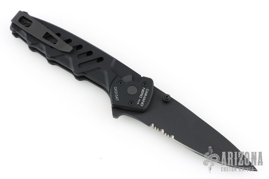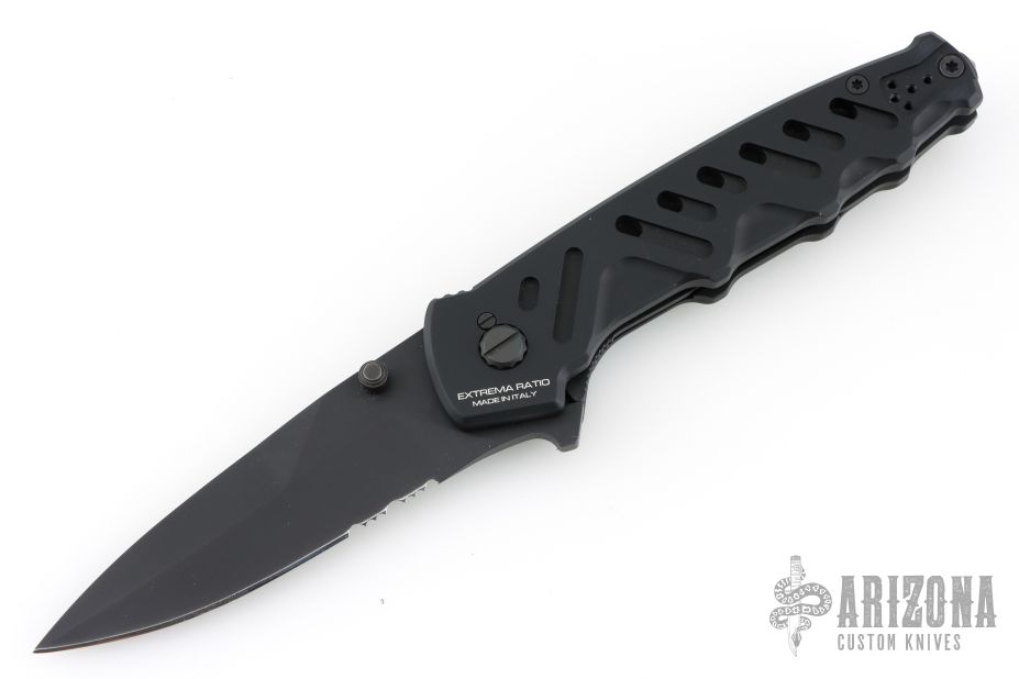 This knife by Extrema Ratio features a black spear point blade with partial serrations.  The handle features a black aluminum with a matching tip up pocket clip.  Includes the original box and papers.  Glass breaker in the butt. Has some light scuffs and scratches, great condition overall.