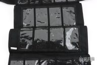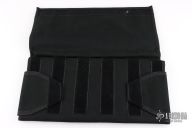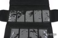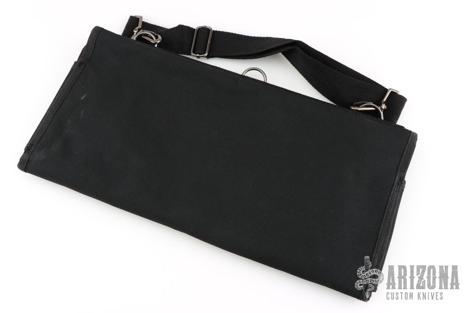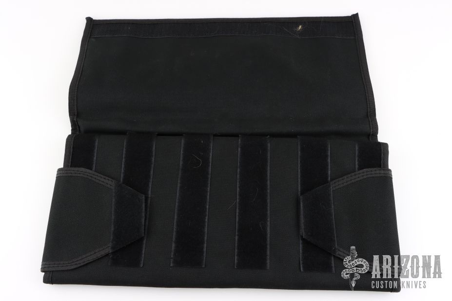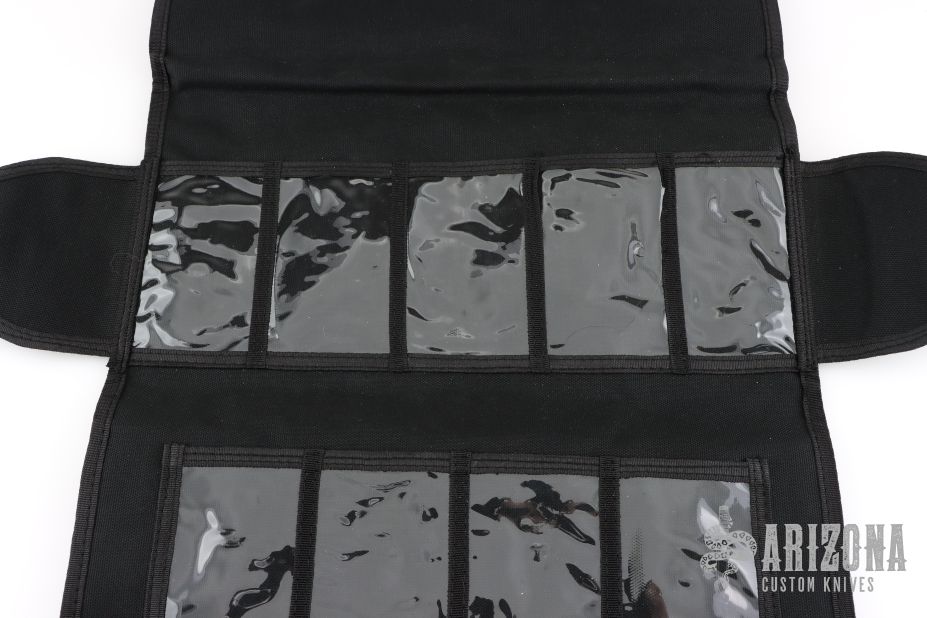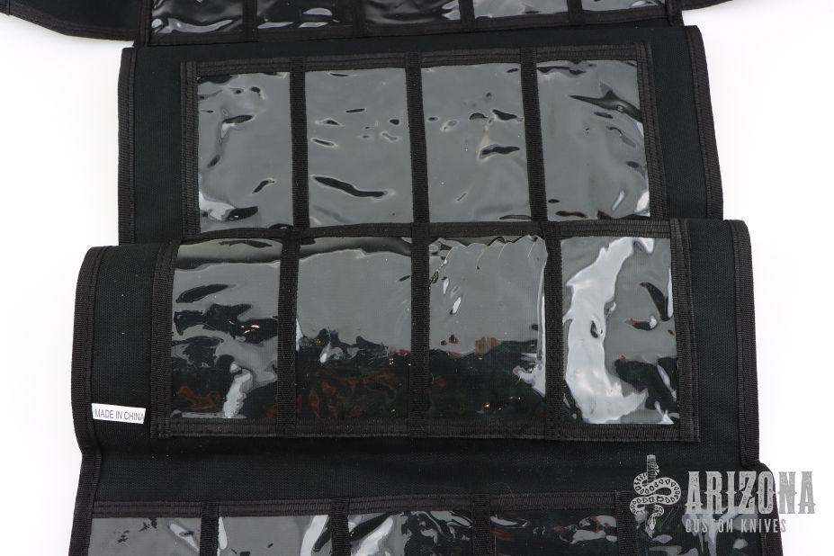 Eighteen-pocket SpyderPac is an impressive and safe way to carry and display your knife collection. It's half the size of the large SpyderPac and fits neatly in a suitcase or portfolio. Each pocket is 4-1/2" X 2-1/2" (114mm X 63.5mm). Measures 15.5" x 7.5" overall closed. Constructed from heavy-denier polyester Cordura, the pack has eighteen deep pockets sized to hold even larger folders. Each pocket is fronted with a clear plastic window for viewing knives tucked inside. It tri-folds over and seals closed by way of a Velcro strip running the width of the pack. The knives remain secure and separated in their pockets and cannot rub or scratch against each other. An adjustable length shoulder strap attaches with two durable steel D-rings letting you hang the pack for display on a wall or sling it over your shoulder to take with you. Spyderco's name and bug logo are embroidered in gold thread on the closing flap. Excellent condition.