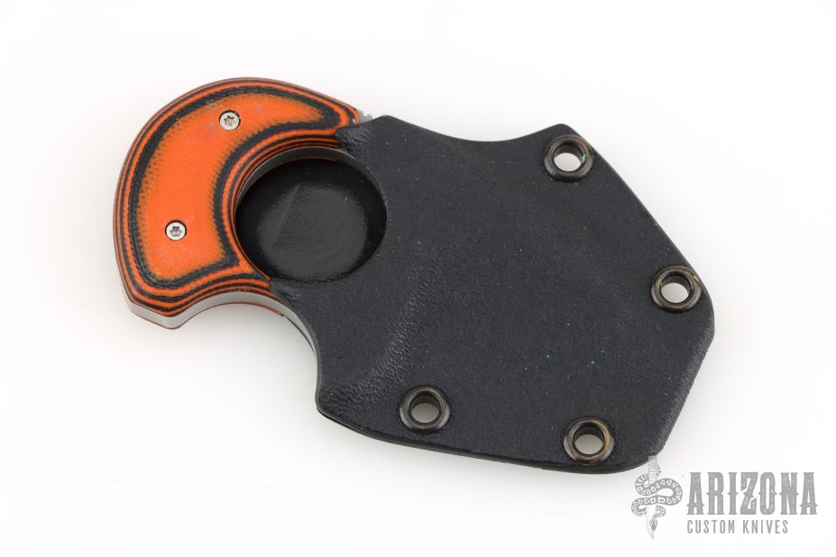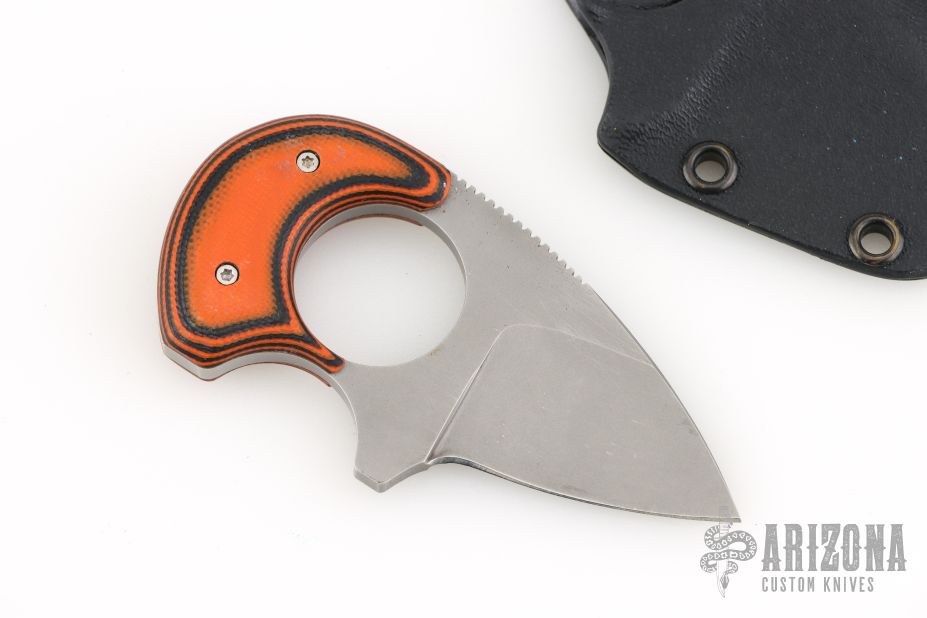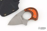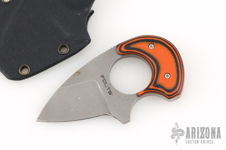 This Baby Bear by Alan Folts features a stonewashed blade with notched thumbrest, .153" blade thickness and 1.200" blade depth, full tang construction. The handle has orange/black G-10 scales. Includes a kydex neck sheath. Has some light scratches and spots, otherwise good condition.