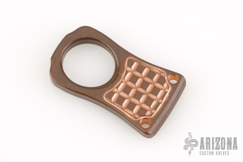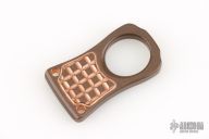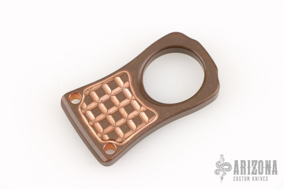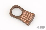 This dirty copper single hole Paperweight from Microtech features a 0.960" finger hole and milled frag patter. 0.372" thick. Excellent condition.