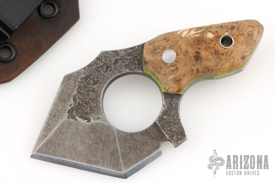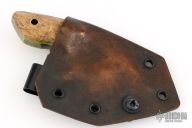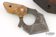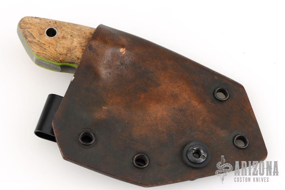 This knife by DG Blade Co features a hand forged blade with a finger hole, .246" blade stock and 2.177" blade depth, full tang construction. The handle has wood scales with green liners, steel pin and lanyard hole. Comes with a wet formed leather sheath with belt clip. Excellent condition.