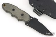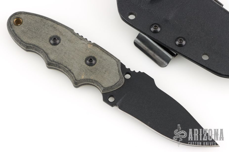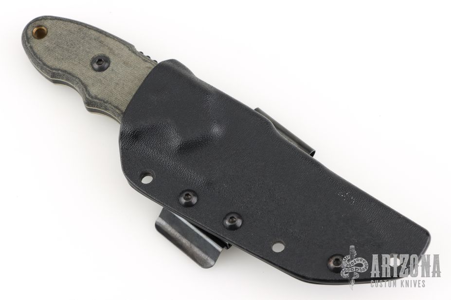 This Scout by Tops knives features a black coated blade with notched thumbramp, .159" blade stock and 1.343" blade depth, full tang construction. The handle has black linen micarta scales with white liners. Comes with a kydex sheath. Has a couple light scuffs, otherwise excellent condition.
