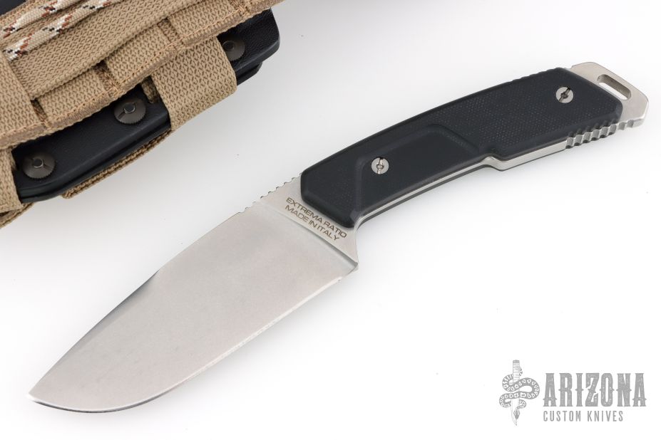 The knife comes with G10 grips that feature the ergonomic design characteristic of Extrema Ratio handles. They can be removed by releasing the skeletonized structure of the knife, that allows maximum lightness with minimum thickness. For lovers of extreme customization, the full-tang structure allows the handle to be covered with a paracord cord.