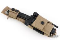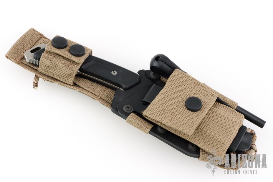The sheath is composed of a part in very light and minimalist Kydex. It can be disassembled and can be adapted for both left and right handed users. The addition of an optional belt clip allows the knife to be positioned both vertically and horizontally and makes the sheath much more versatile than the textile version. It is also equipped with a mini pouch with M.O.L.L.E. system. containing a two-sided stone for sharpening and a Firesteel for lighting fires”.