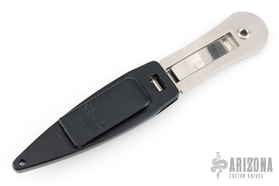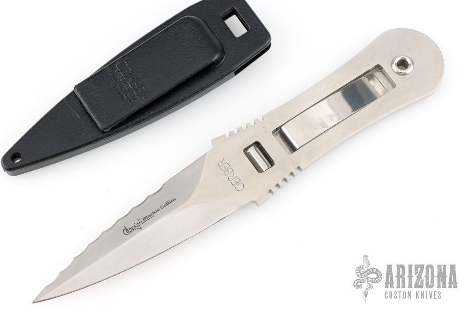 This boot knife by Gerber is a Blackie Collins design, it features a satin finished blade with one plain edge and one serrated edge, .168" blade stock and 1.083" blade depth, full tang construction. The handle has a clip that holds it in the sheath. Comes with black plastic sheath. Has a few light scratches, otherwise excellent condition.