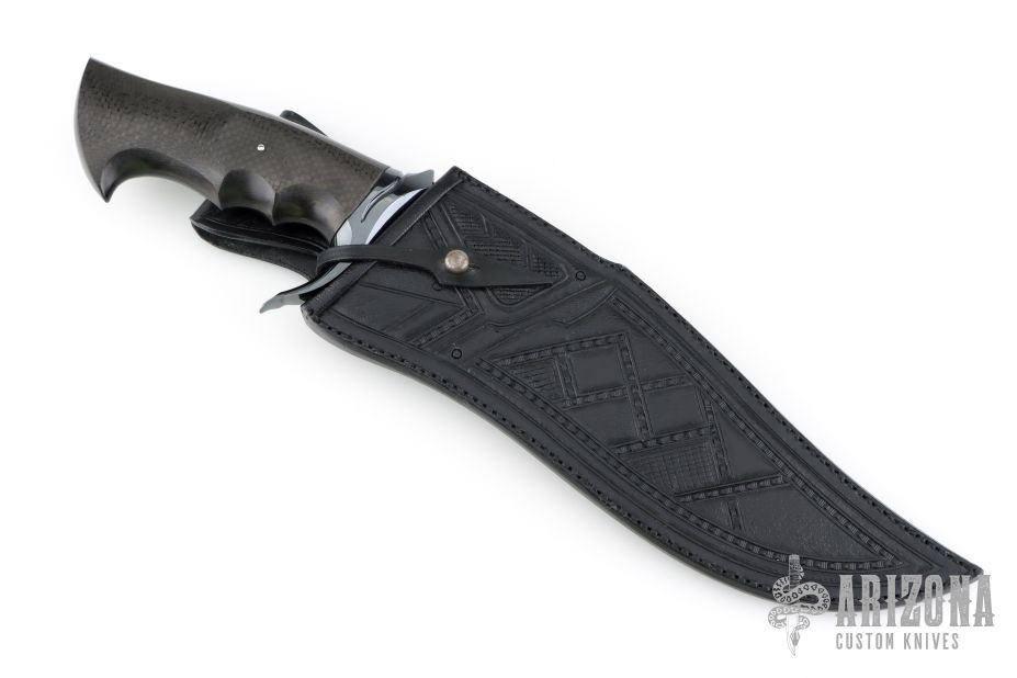 This Bowie Fighter features a recurve Damascus blade with sharpened top edge, .261" blade stock and 2.392" blade depth, hidden tang construction. CAS logo on the blade spine. The guard is blued and fluted steel with a carbon fiber grip, stainless pin. This piece comes in an equally impressive, hand tooled, black leather sheath. Has some scuffs and scratches, otherwise good condition.