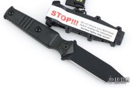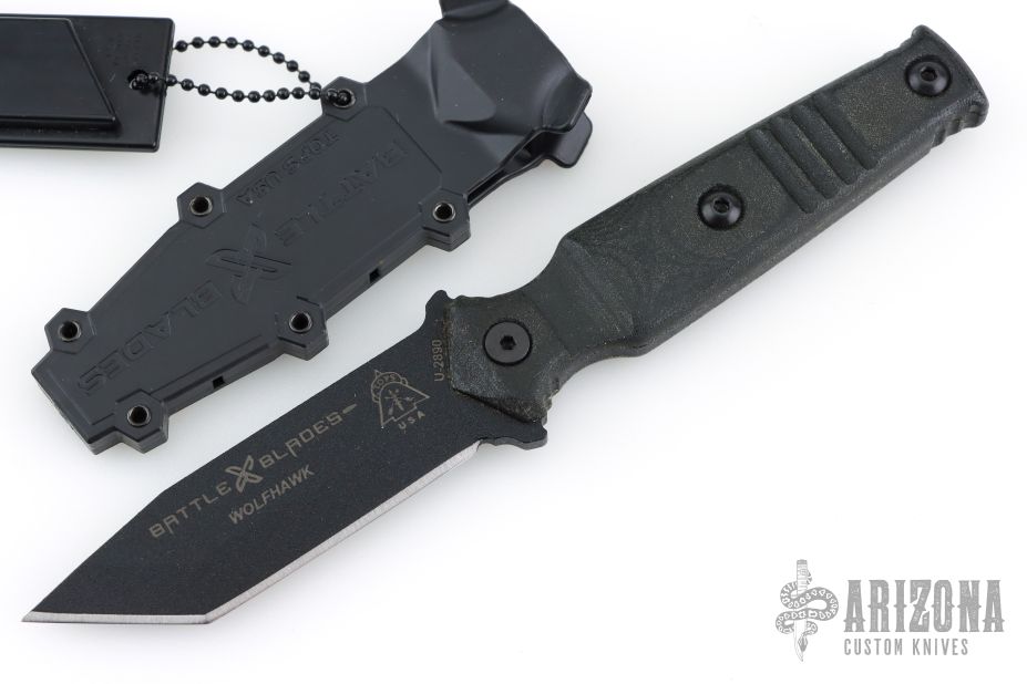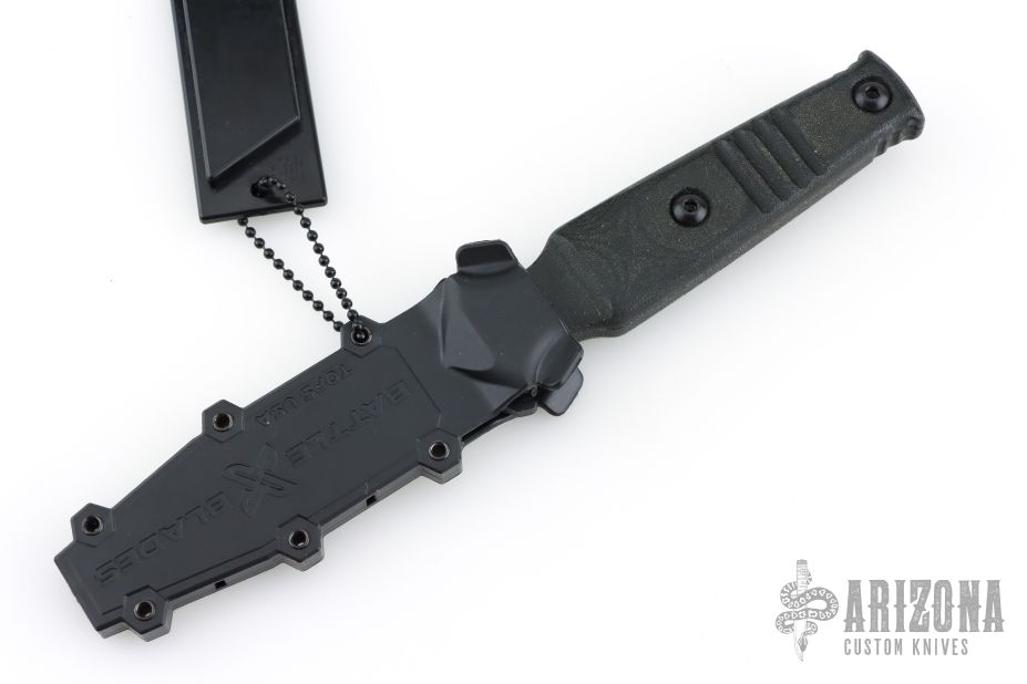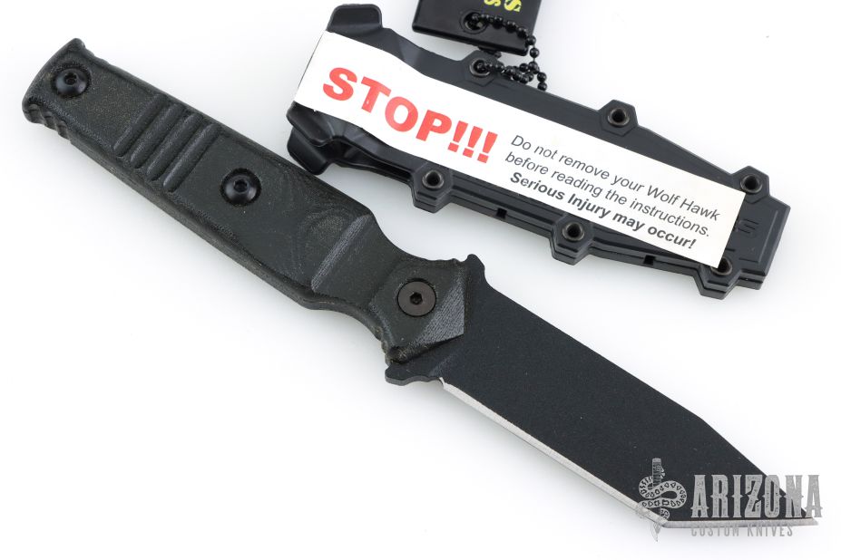 This knife features a black tanto blade with a full tang construction. .167" Blade Stock. .986" Blade depth. The handle has black G10 scales. Includes a black plastic sheath. Excellent Condition.