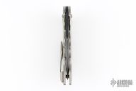 This Double Homicide Linerlock Flipper by Jeff VanderMeulen has a W2 steel multi-ground clip point/ recurve/ tanto blade with a hamon. The handle has orange peel finished titanium scales and matching clip positioned for tip up carry, hidden clip screws. Excellent action on caged bearings, centered blade, and solid lockup with zero blade play. This piece is in excellent condition and shows no signs of use or carry. Comes with a zippered case and COA #11 and dated 11/2013
