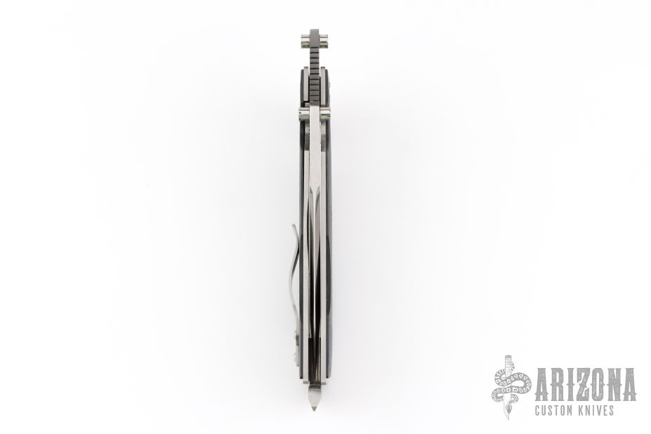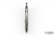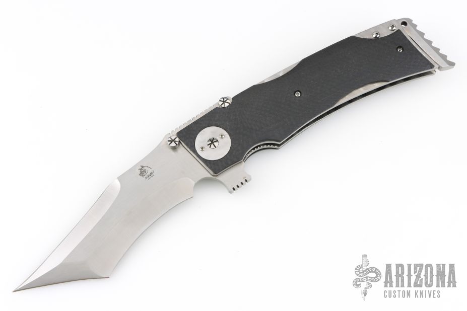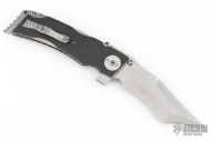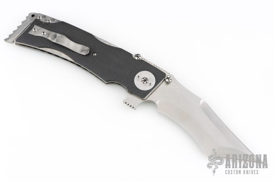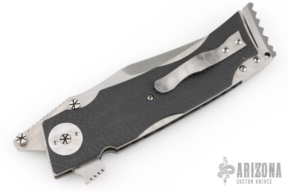 This Linerlock Flipper by Mike Franklin features a satin finished blade with notched thumbrest, flipper and dual thumbstuds. The handle has carbon fiber scales, jeweled titanium liners, stainless steel backspacer with lanyard hole, tip up jeweled titanium clip. Nice detent, and lock and blade seating. Has some light scratches, otherwise excellent condition. Dated 12/07