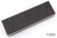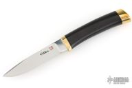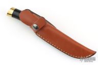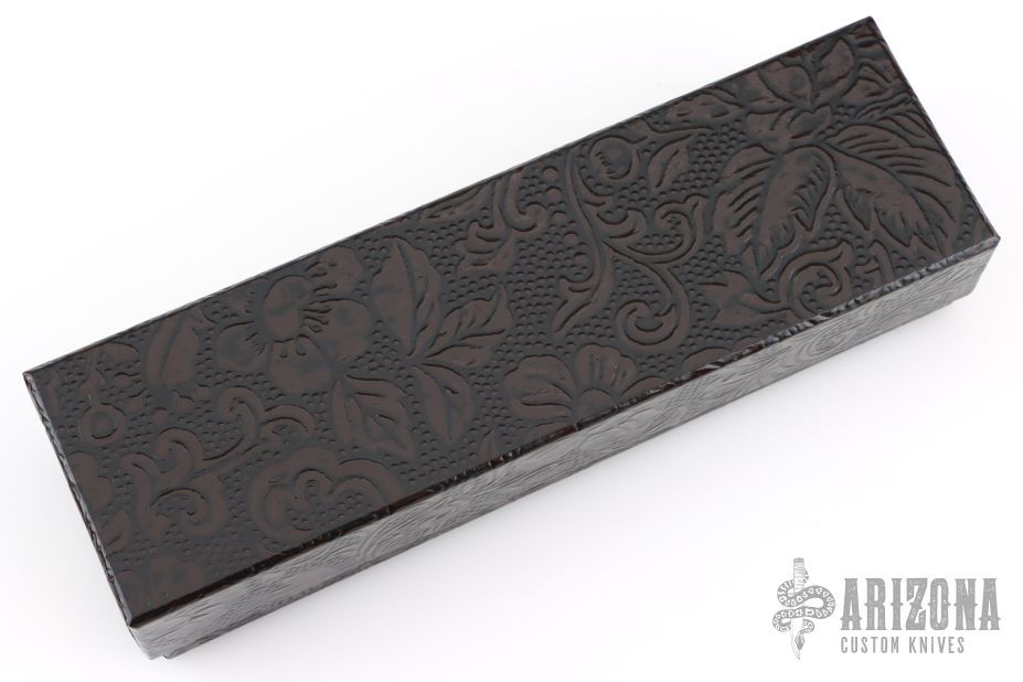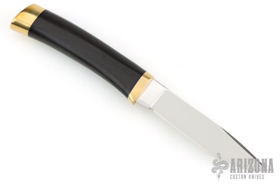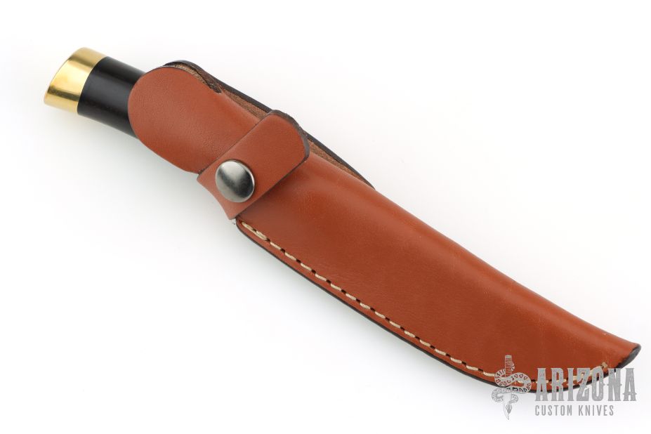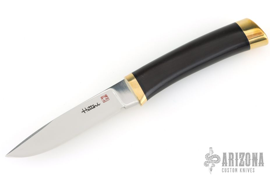 This knife by Hattori features a satin finished drop point blade with false top edge, .156" blade stock and .748" blade depth, hidden tang construction. The handle has a brass guard and butt, rosewood grip with black spacers. Comes with original box, papers, and brown leather sheath. Excellent condition.