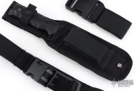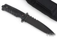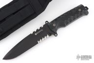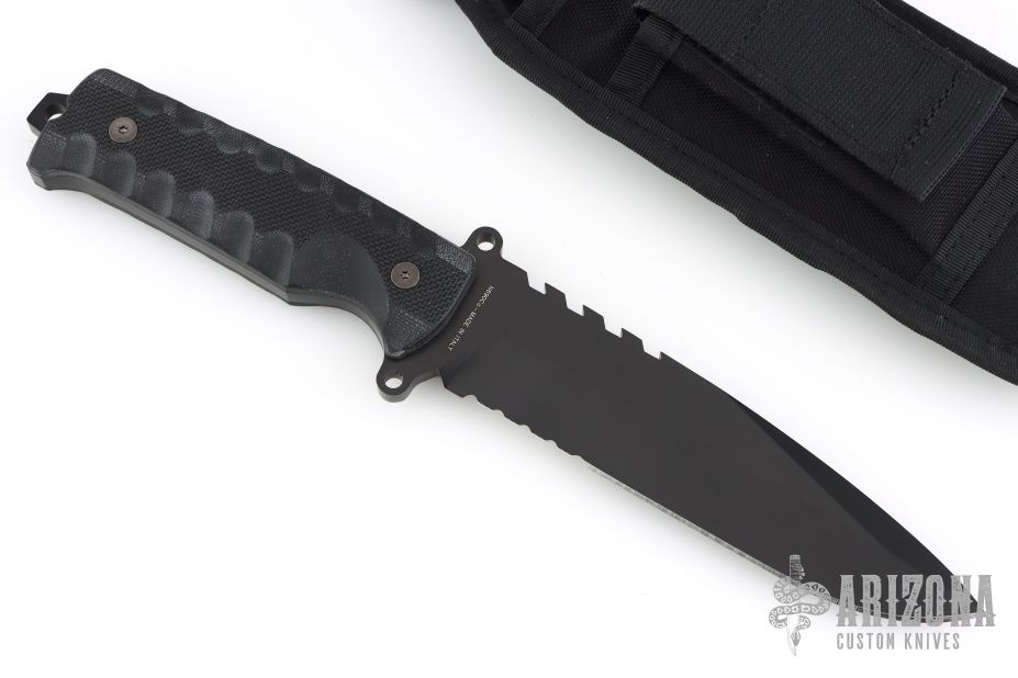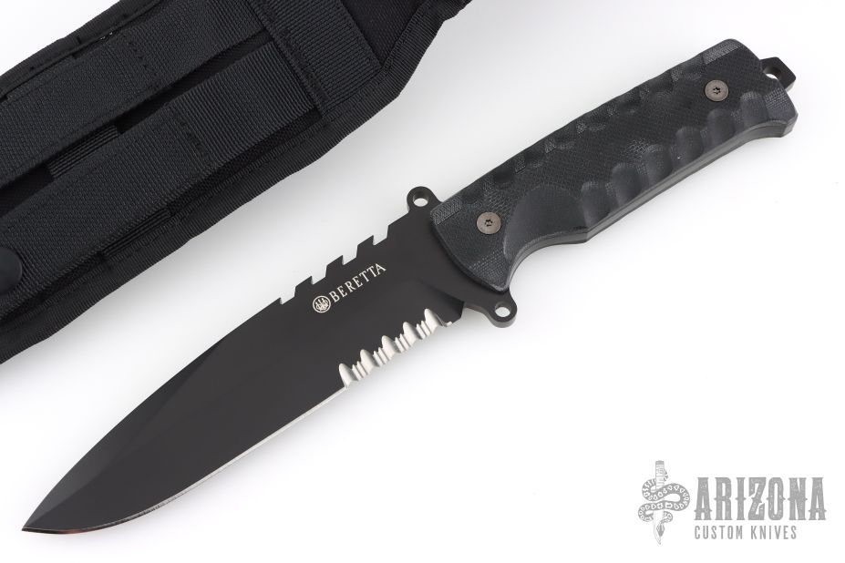 This Beretta tactical knife features a black drop point blade with faux saw teeth, partial serrations, swedge, .239" blade stock and 1.5" blade depth. The handle has textured G10 covers, integral guard, full tang, and exposed tang lanyard hole. Comes with original box and sheath. Excellent condition.