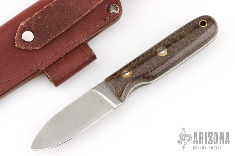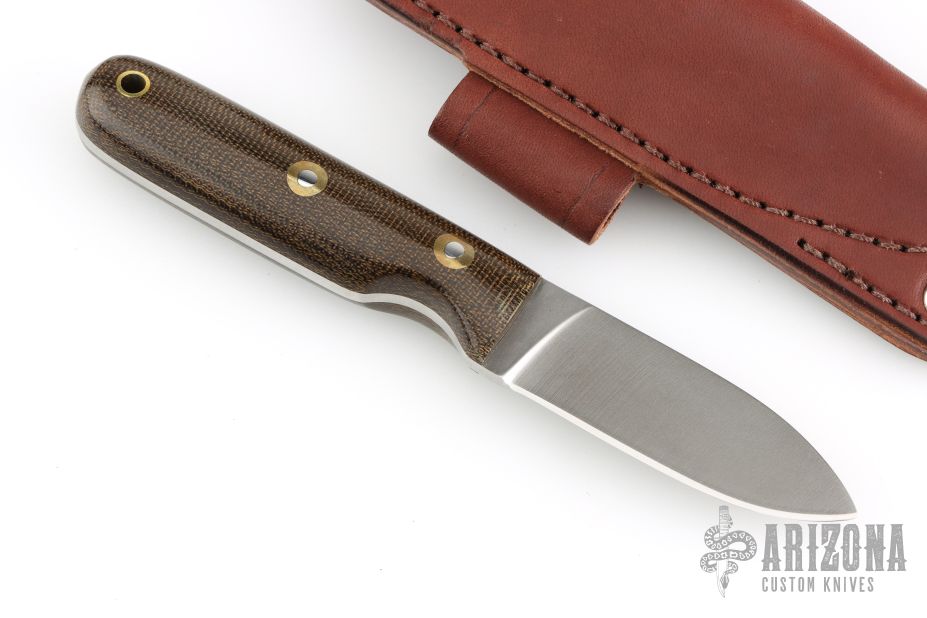 This Knife by Blind Horse Knives features a satin finished full face ground blade with .122" blade stock and .949" blade depth, full tang construction. The handle has polished green canvas micarta scales.  Includes a brown sheath with belt loop. Excellent condition.