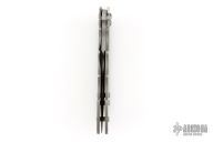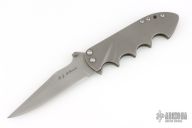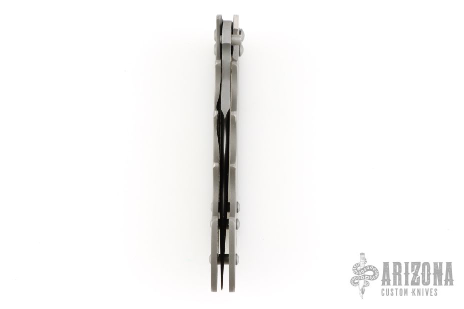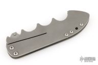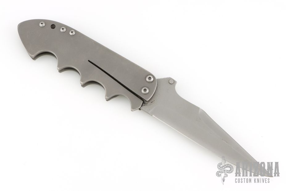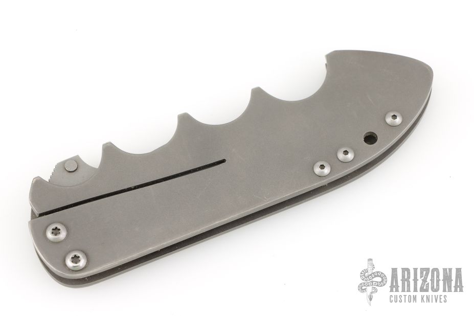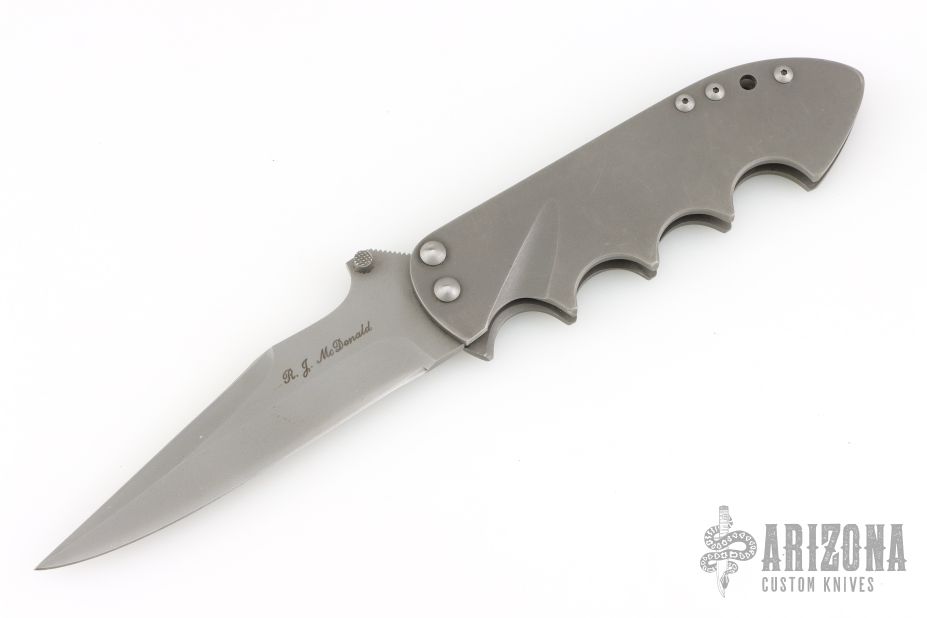 This Folding Fighter by R.J. McDonald features a bead blasted blade with sharpened top edge, a checkered thumbstud and notched thumb ramp. The handle has a bead blasted titanium frame. Lanyard hole in pommel. Nice detent and lockup. Has some scuffs, otherwise good condition.