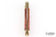 This Swivel Bolster from AB Italy features a 240 Layer Damascus bayonet ground blade with false top edge. The handle has brass bolsters, briarwood scales over brass liners and stainless steel backspacer. Excellent condition. Comes with original box and COA.
