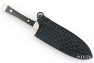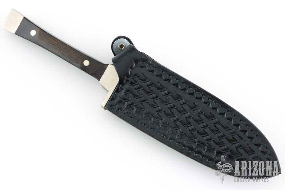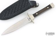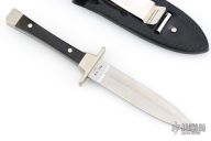 This Boot Knife by Case Knives features a double edged satin finished spear point blade. The handle is comprised of a nickel silver guard and pommel with wood scales over full tang construction. Comes with a leather belt sheath with metal clip and button. Has some scratches, oxidation and a light patina. Great overall condition. .101" blade length .883" blade depth.