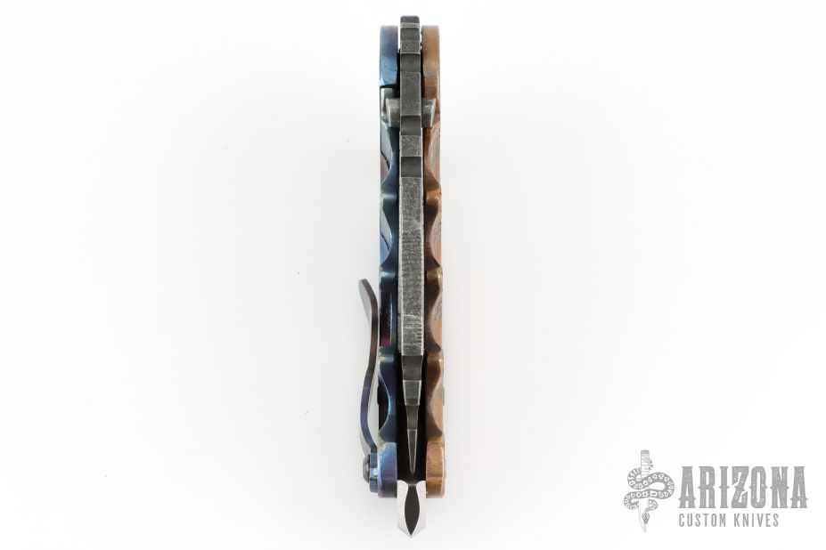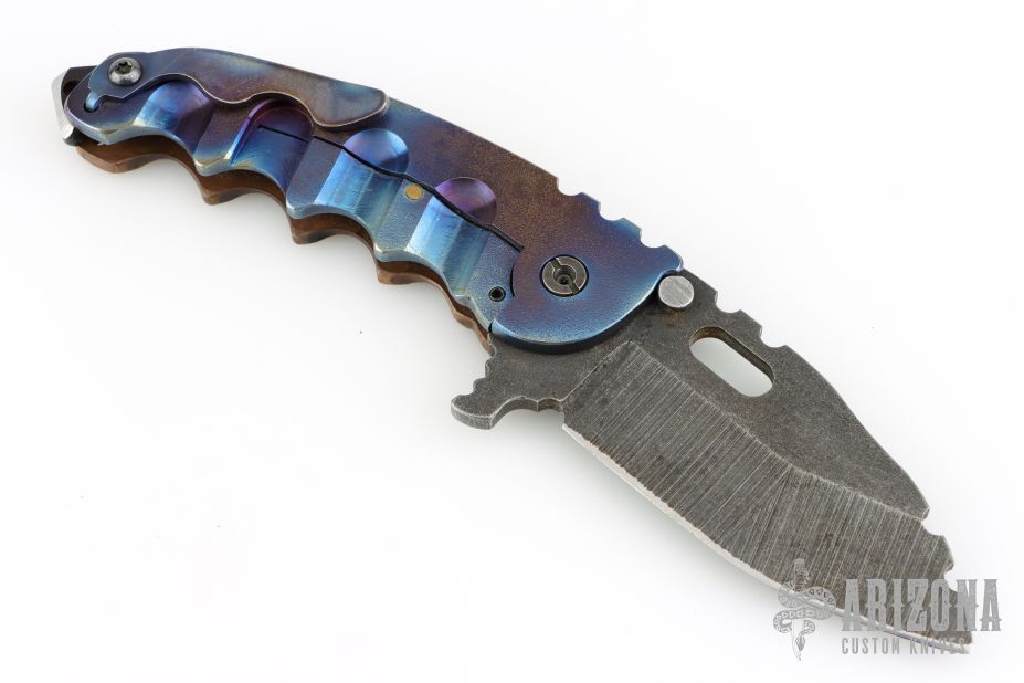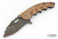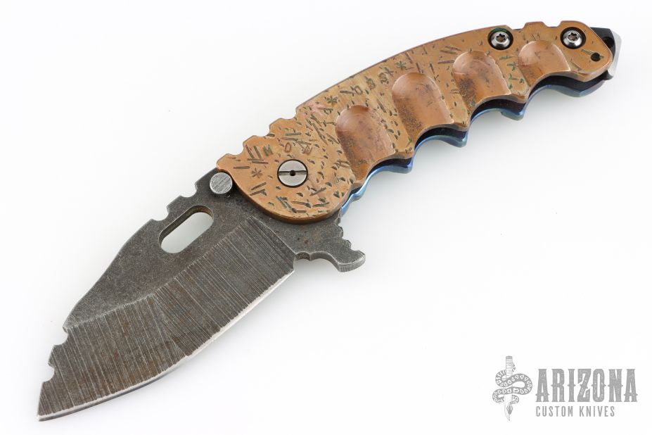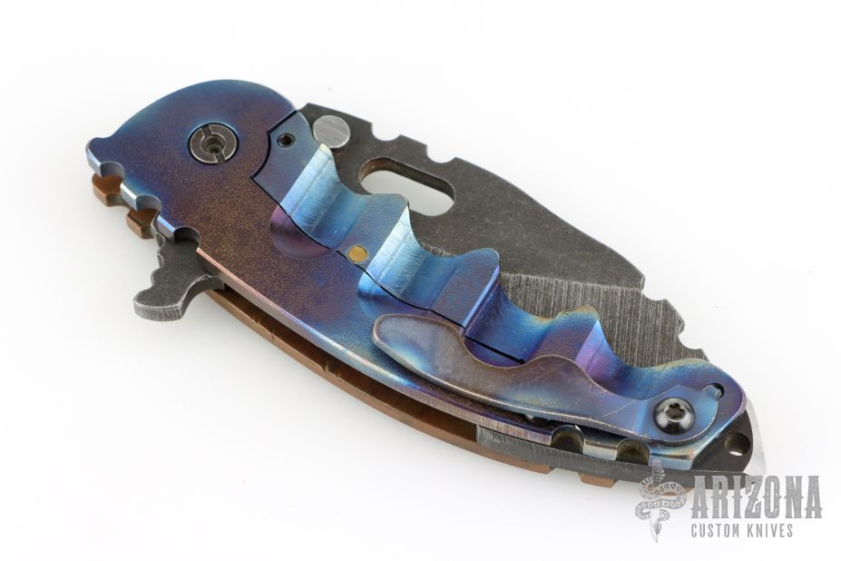 This Man of War flipper by TS Heeter features a dark stonewashed blade with notched thumbrest, thumbhole and flipper. The handle has a hammer marked copper and anodized titanium frame with tip up reversible titanium clip, CPM 3V steel backspacer. Rides on bearings. Nice detent, lockup and blade seating. Includes original box, papers dated 1-18-16. Has a couple light scratches, otherwise excellent condition.