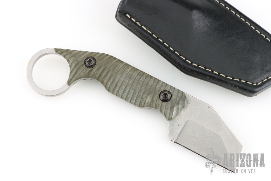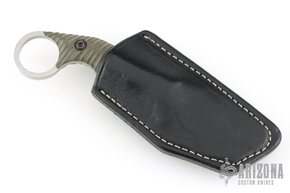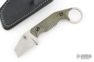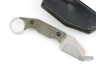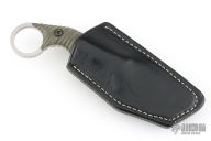 The GMT SRR from Graham Knives features a stonewashed finish with .181" blade stock and 1.258" blade depth, full tang construction. Mr. Graham's logo is etched onto the presentation side. Handle scales are contoured/milled green G-10. Knife comes in a custom black leather sheath with white stitching and pocket clip. Has a small oxidation spot on the tang, otherwise excellent condition.
