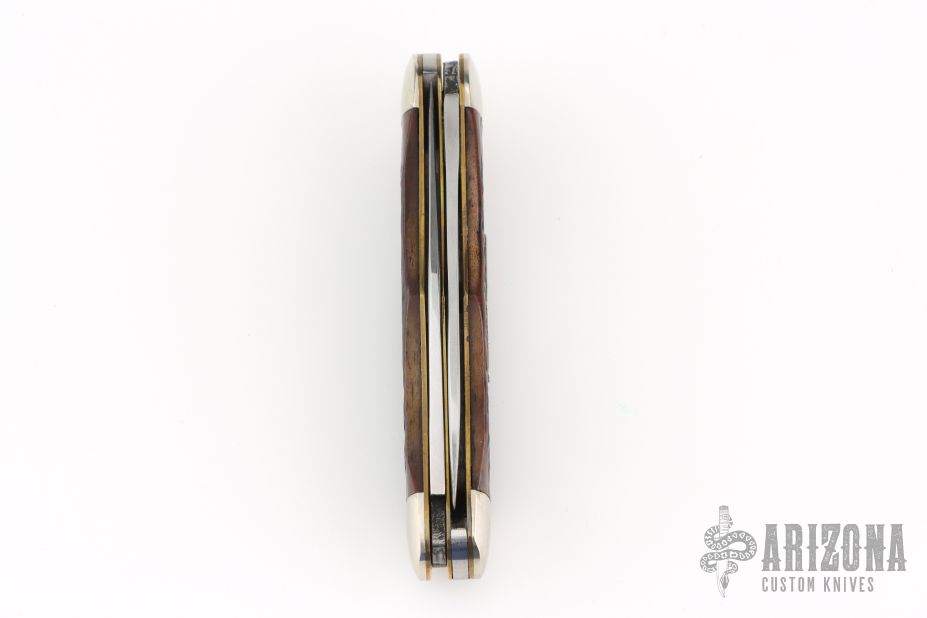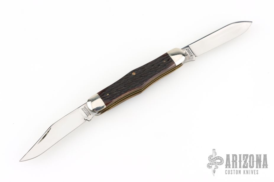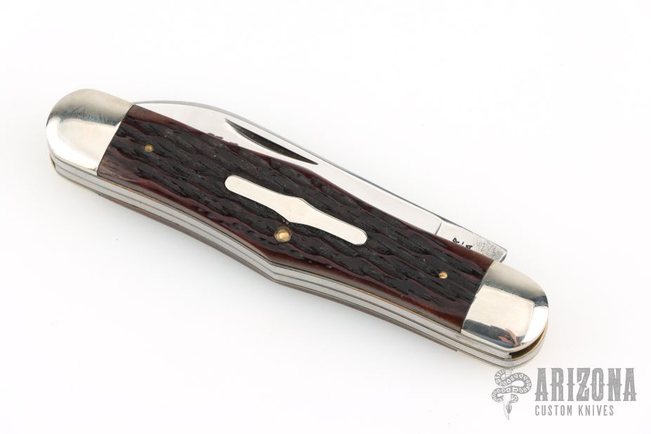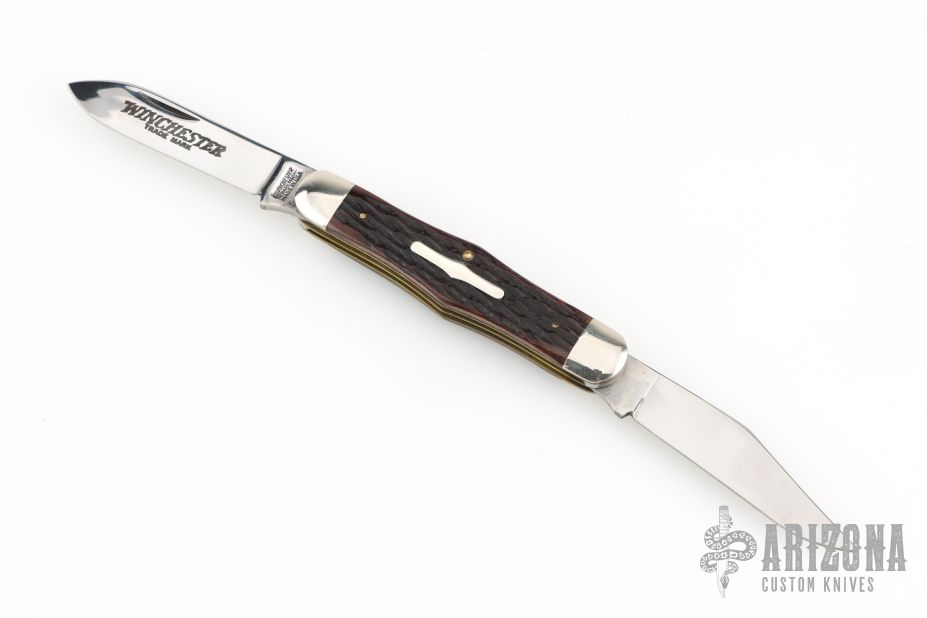 This Winchester folder features two mirror polished blades. Nickel Silver front and rear bolsters with jigged bone covers. Brass liners and steel springs. Has a couple light scratches, otherwise excellent condition.
