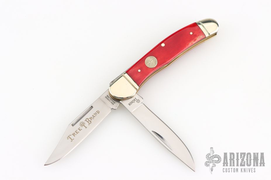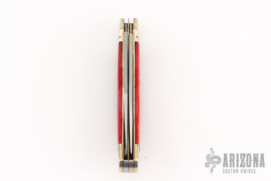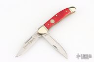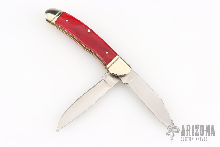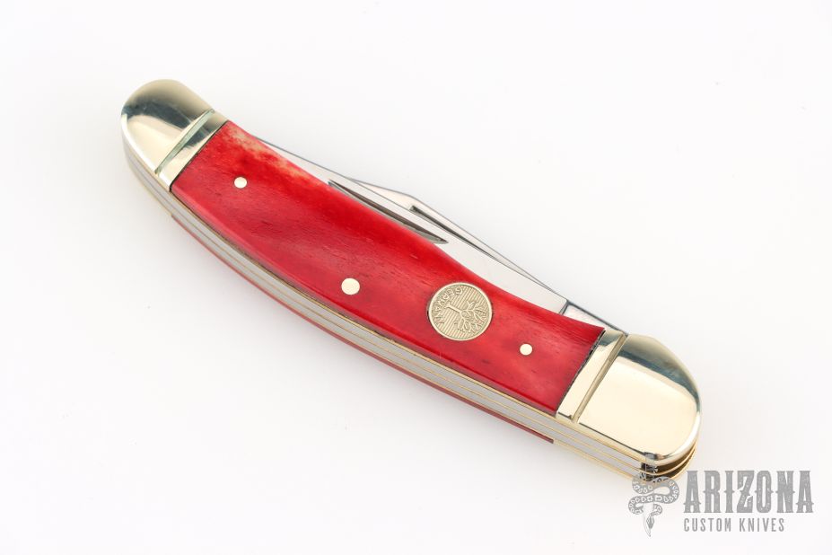 This 2-Blade Trapper by Boker features mirror polished blades with nail nicks. The handle has fluted nickel silver bolsters, smooth red bone covers, brass liners, stainless steel springs. Has a couple light scratches, excellent condition otherwise.