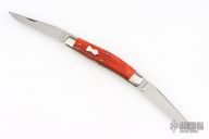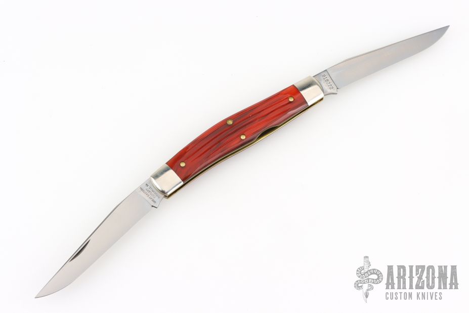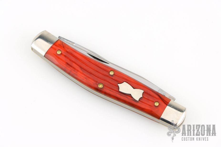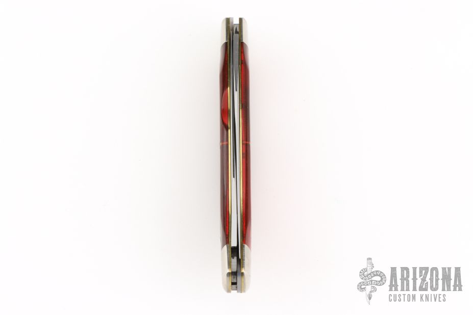 This knife by Great Eastern Cutlery features 2 satin finished blades with nail nicks. The handle has nickel silver bolsters and escutcheon, textured coffee house acrylic covers, brass pins and liners with a steel spring. Comes with original tube. Excellent condition.