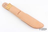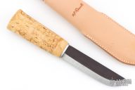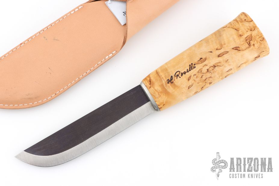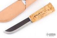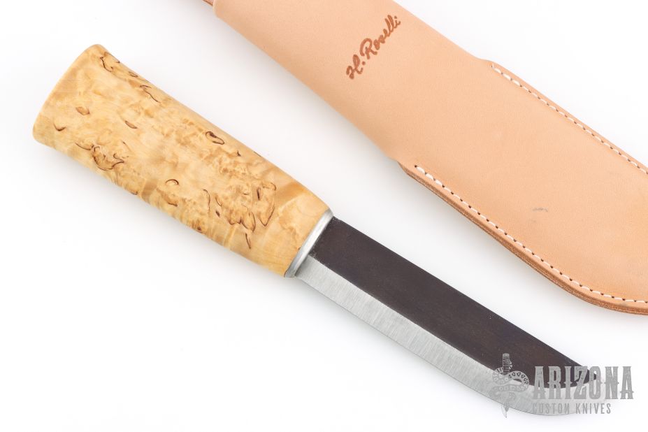 This Leuku from H. Roselli features a carbon steel blade with forge finish flats. The handle is comprised of curly birch over hidden tang construction. Includes leather sheath with belt loop. Blade Steel: Carbon Steel .197" blade stock and 1.198" blade depth. Has a light patina. Excellent condition.