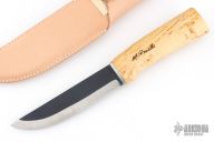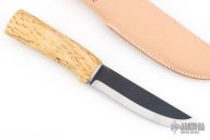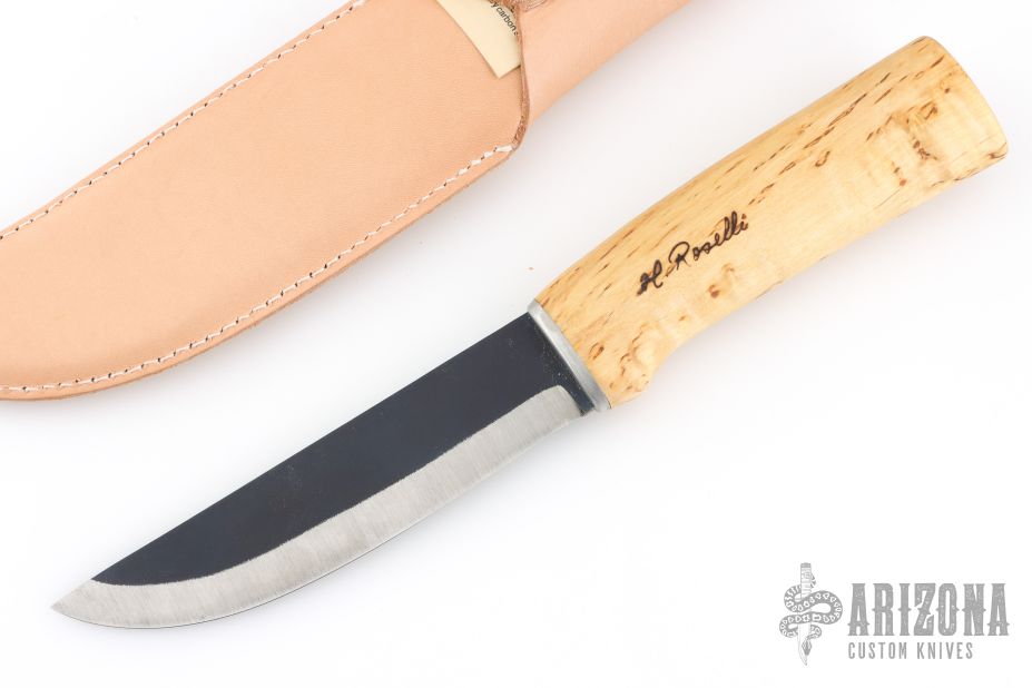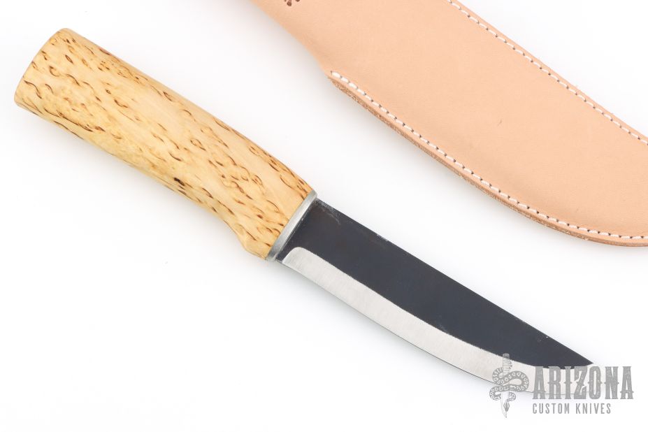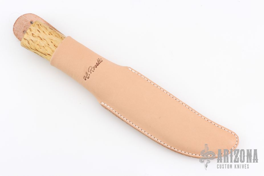 This knife from H. Roselli features a carbon steel blade with forge finish flats. The handle is comprised of curly birch over hidden tang construction. Includes leather sheath with belt loop. Blade Steel: Carbon Steel .120" blade stock and 1.18" blade depth. Has a light marks. Excellent condition.