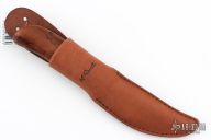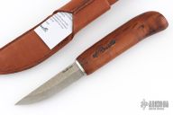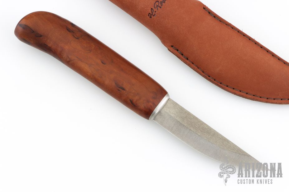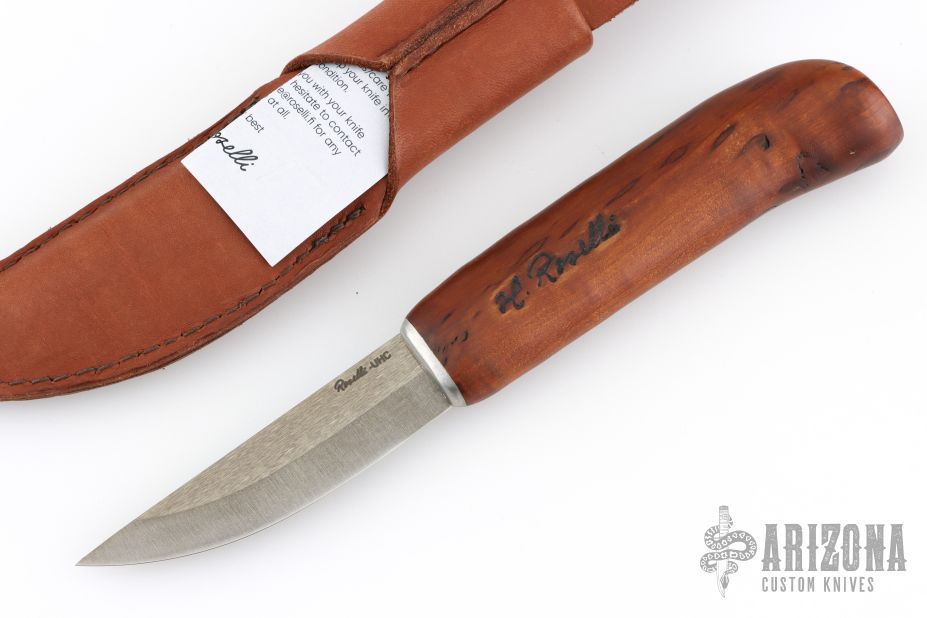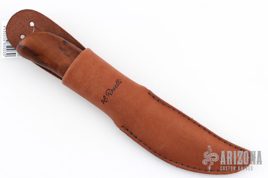 This knife from H. Roselli features a carbon steel blade with forge finish flats. The handle is comprised of curly birch over hidden tang construction. Includes leather sheath with belt loop. Blade Steel: Carbon Steel .124" blade stock and .79" blade depth. Has a couple light marks. Excellent condition.