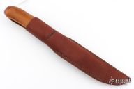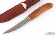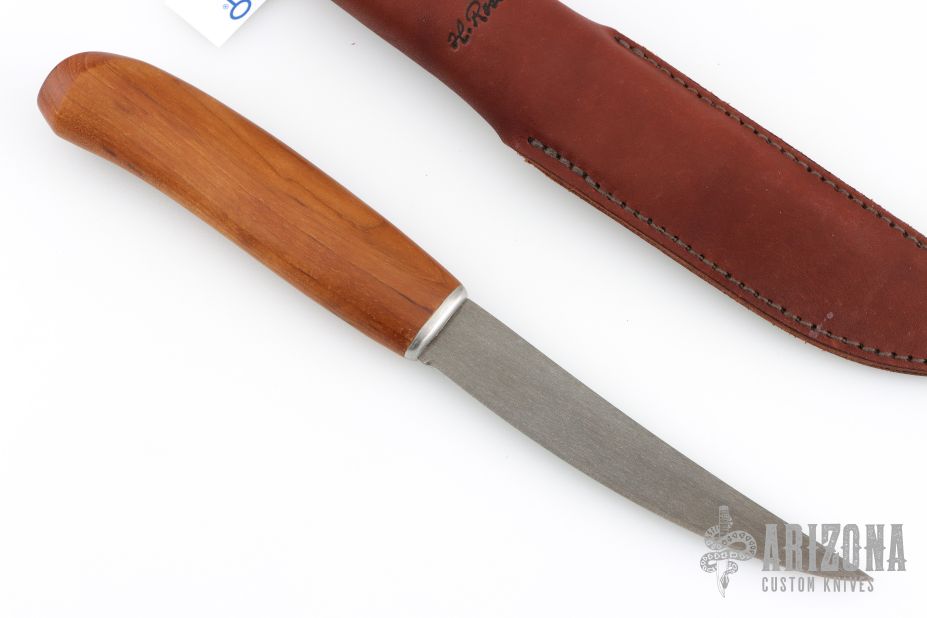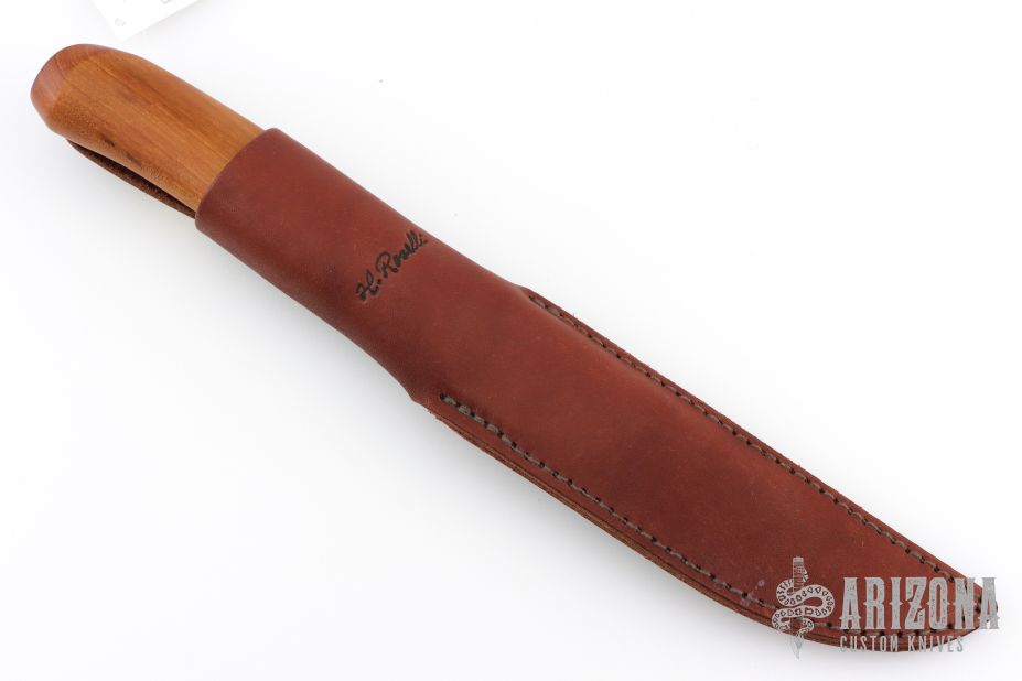 This knife from H. Roselli features a carbon steel blade with forge finish flats. The handle is comprised of curly birch over hidden tang construction. Includes leather sheath with belt loop. Blade Steel: Carbon Steel .038" blade stock and .8" blade depth. Has a couple light marks. Excellent condition.