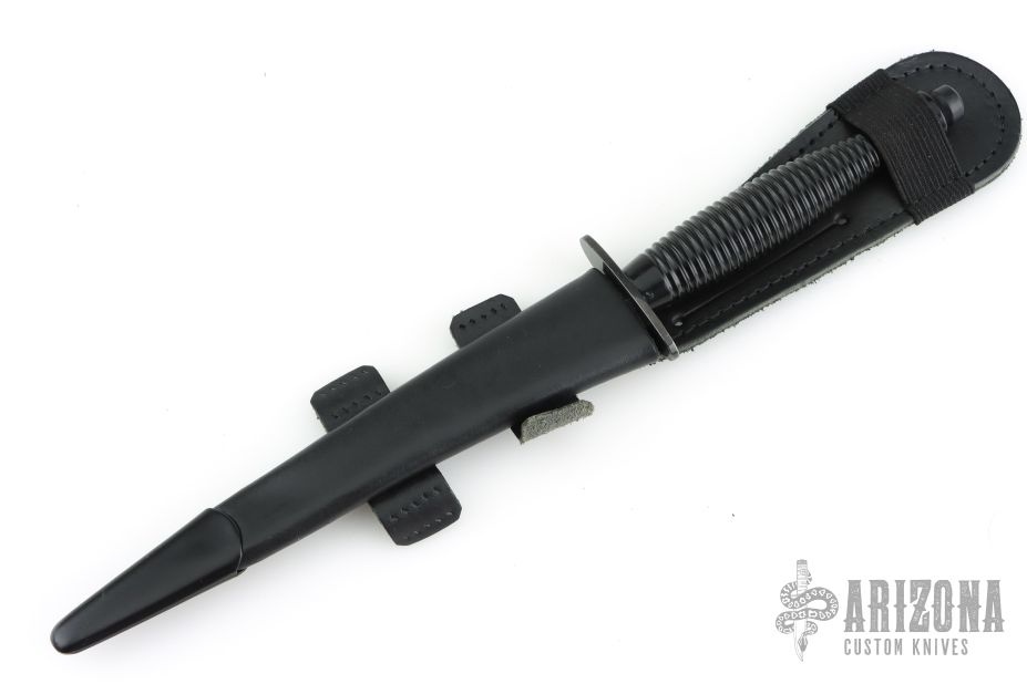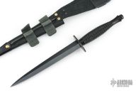 This Fairbairn-Sykes dagger by William Rodgers features a double edged black blade. The handle is comprised of blackend steel guard with ribbed and blackened brass handle with blackened pommel over hidden tang construction. Includes leather sheath with belt loop. Has some minor wear on the handle finish, otherwise excellent condition. Stamped "William Rodgers Sheffield England" on guard.