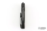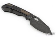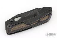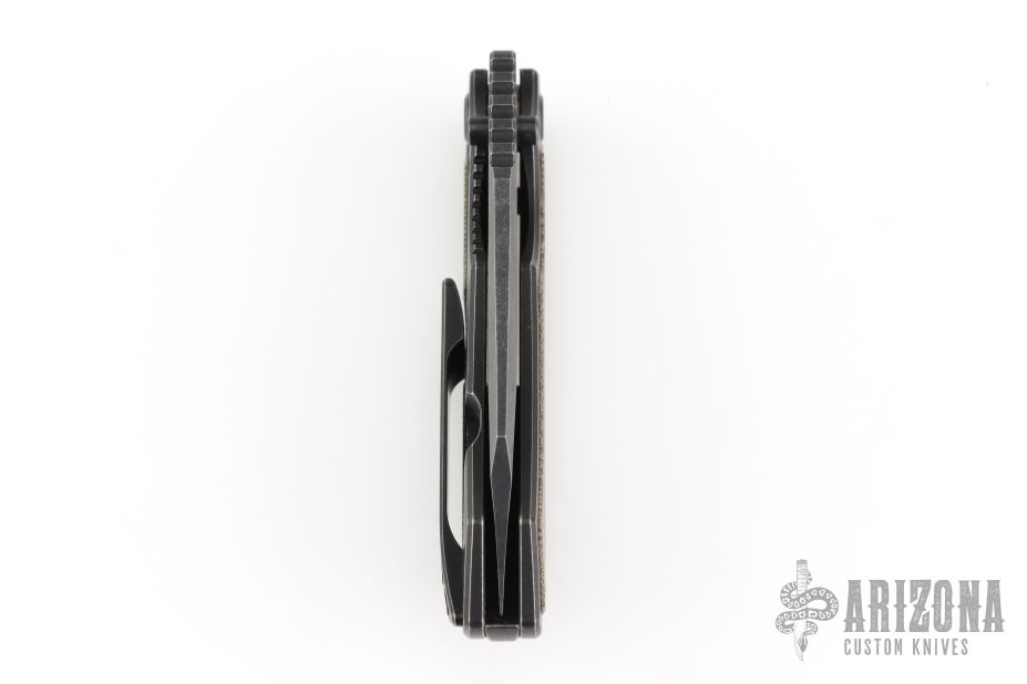 This Evolution 3.0 by Custom Knife Factory features a dark stonewash finished blade with notched thumbrest and thumbhole. The handle has a dark stonewashed bark finished titanium frame with a backspacer. Micarta inlays, and matching titanium tip-up clip. Comes with Maker's velcro case, extra hardware, and COA. Nice detent, lockup and blade seating. Excellent condition. #340 and dated 8-22.