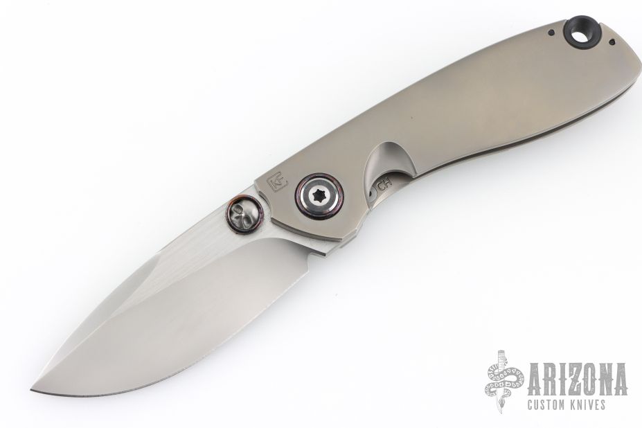 The new Rampage model is a Collaboration with CKF and Copperhead Metalworks. It features a two-tone Bohler M390 blade with titanium handles. It has ZircuTi pivot collars, thumb stud collar, and pocket clip. It has a unique oversized titanium skull thumb stud to open it with. Inside the scales you will find internal milling detailed with CKF & MRBS branding.