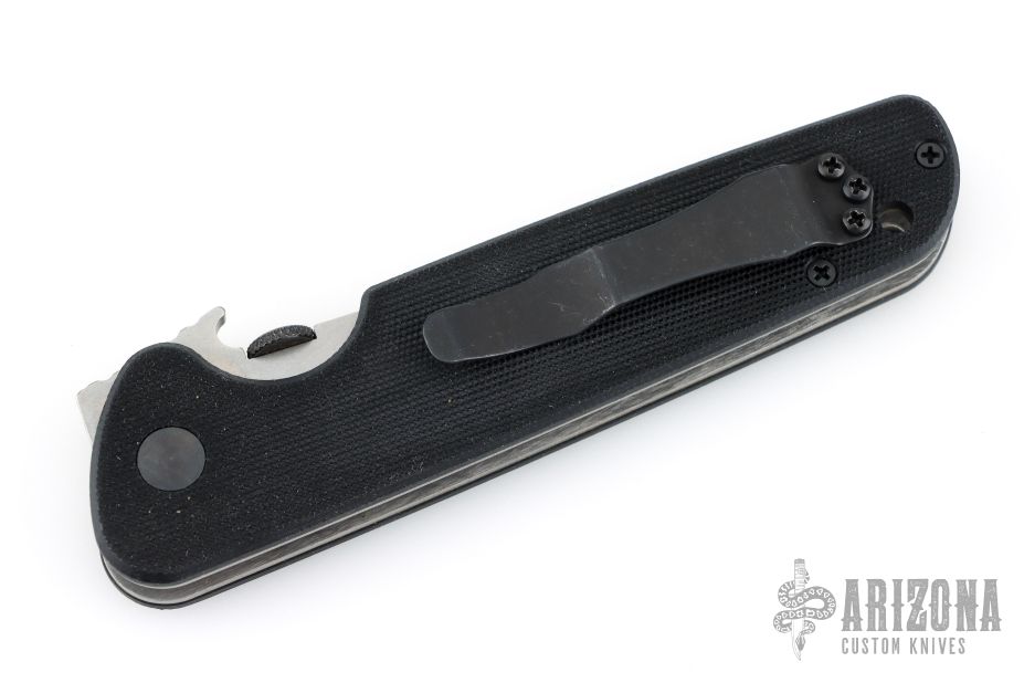 This Kwaiken by Emerson Knives features a stonewashed upswept blade with swedge, knurled thumb disc, wave feature. The handle has black G10 scales over titanium liners and standoffs. Black coated tip up clip and lanyard hole in pommel. #0496. Excellent condition. Comes with original box and papers.