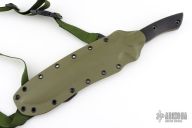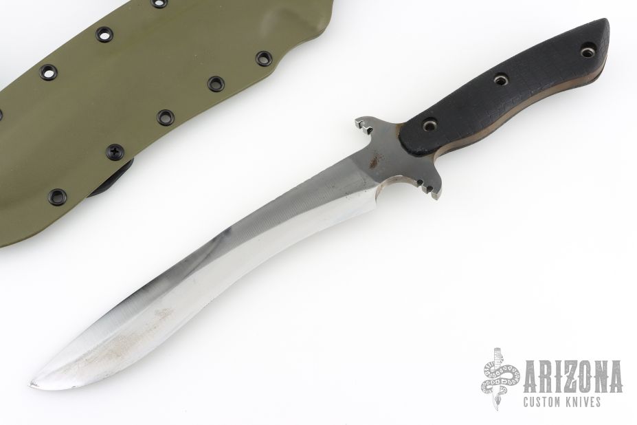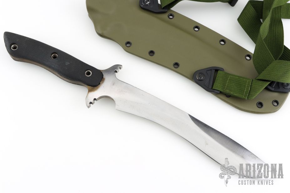 This Mamba 9-L by Blackjack Knives features a satin polished recurve blade with a false top edge and notched thumbrest, .256" blade stock and 1.486" blade depth, full tang construction. The handle has rubber scales. Comes with a custom kydex sheath with shoulder rig. This knife has some scratches and oxidation spots, oxidation on the tang, has scratches, has been sharpened, good user condition.