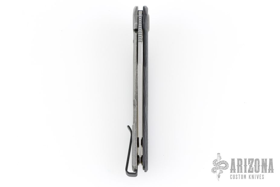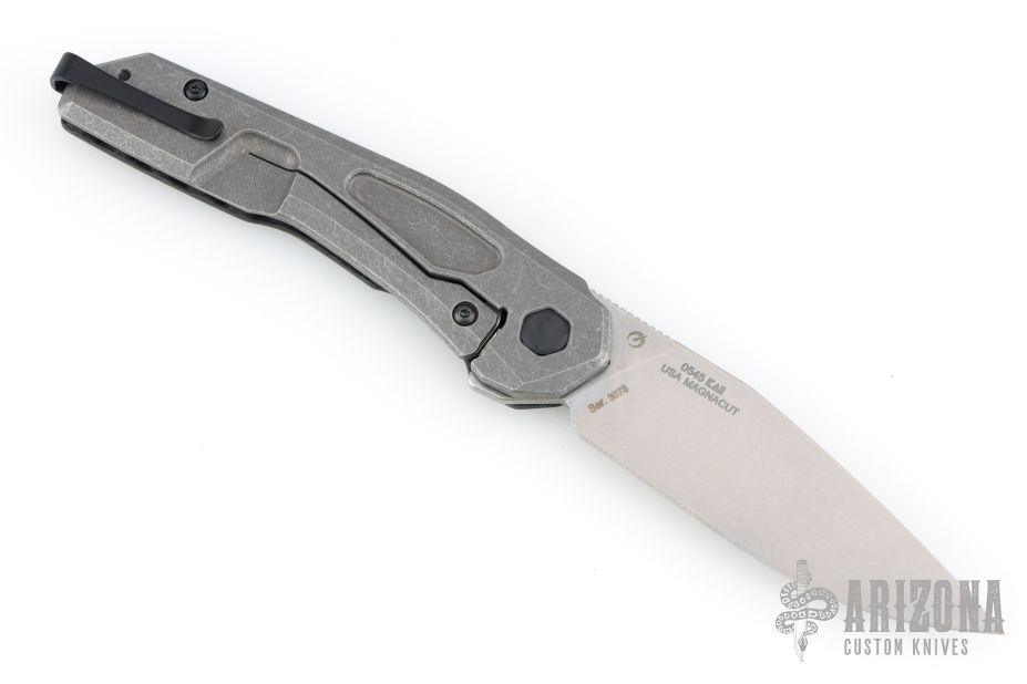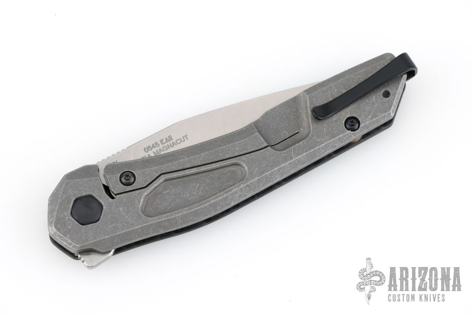 - Stonewashed MagnaCut steel blade with a plain edge.