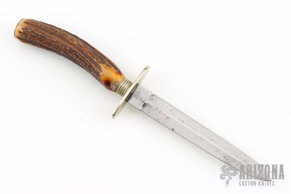 This antique dagger by Joseph Allen & Sons of Sheffield England features a double edged satin finished blade with .100" blade stock and .605" blade depth, hidden tang construction. The handle has nickel silver guard and fluted collar, stag grip and a nickel silver butt. Has scratches and patina, otherwise good condition for its age.