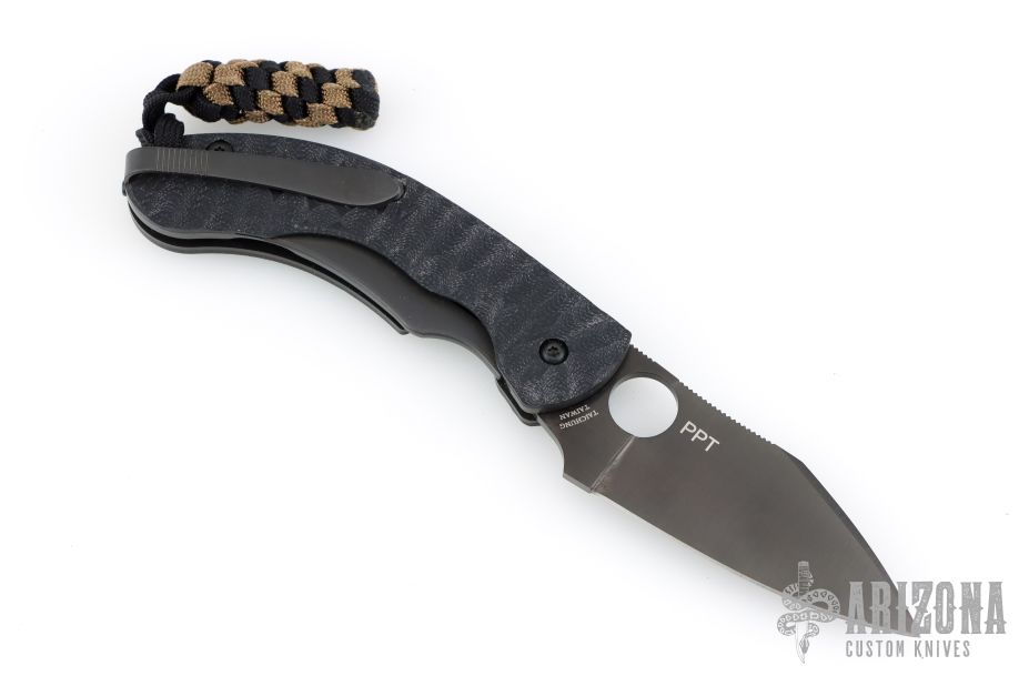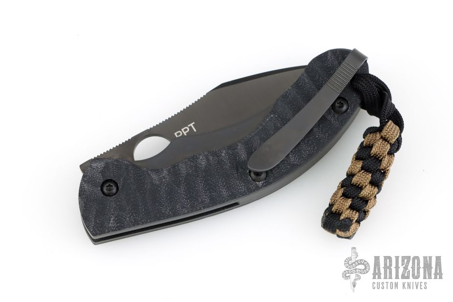 This Perrin PPT has a black TiCN coated finished CPM S30V stainless steel drop point blade with thumb hole and notched thumbrest. Handle is black G-10 over black stainless steel liners and backspacer. Black stainless steel tip up clip. Comes with original box and papers. The knife has a couple light scuffs, but is in otherwise excellent condition.