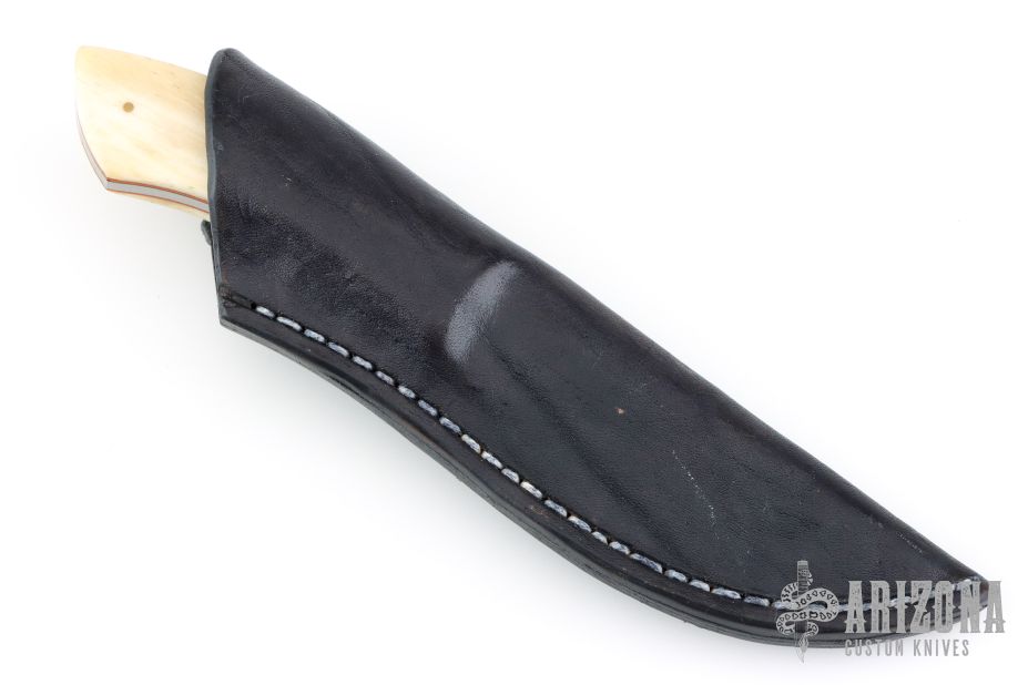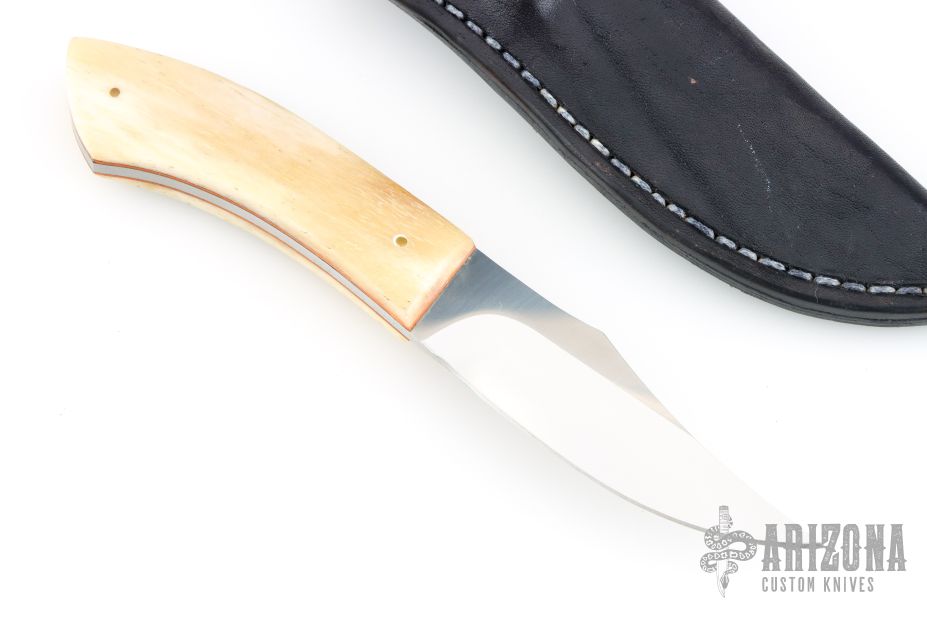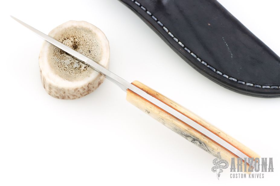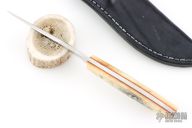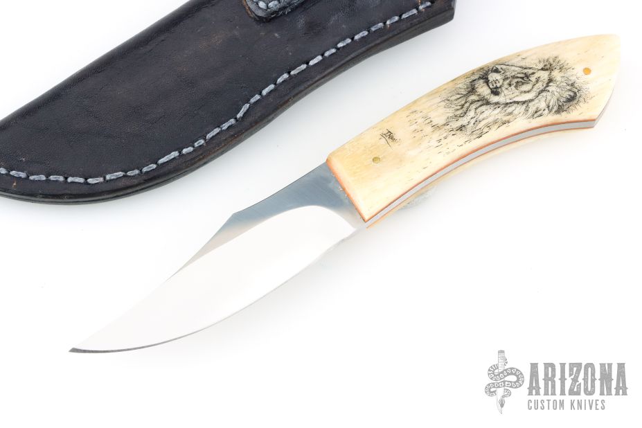 This Hunter by Nkosilathi Jubane features a mirror polished blade with satin finished flats, .131" blade stock and 1.007" blade depth, full tang construction. The handle has bone scales with orange liners and brass pins. The front scale has scrimshaw of a lion done by the maker. Comes with a black leather sheath. Has a couple very light scratches, otherwise excellent condition.