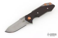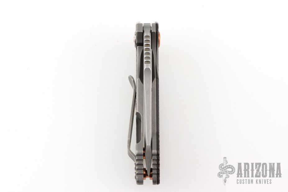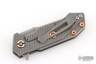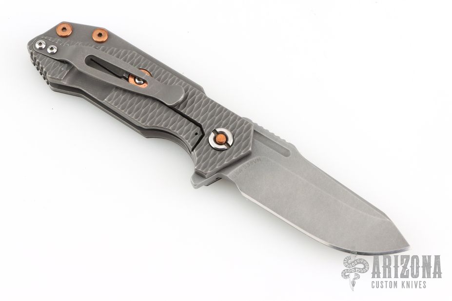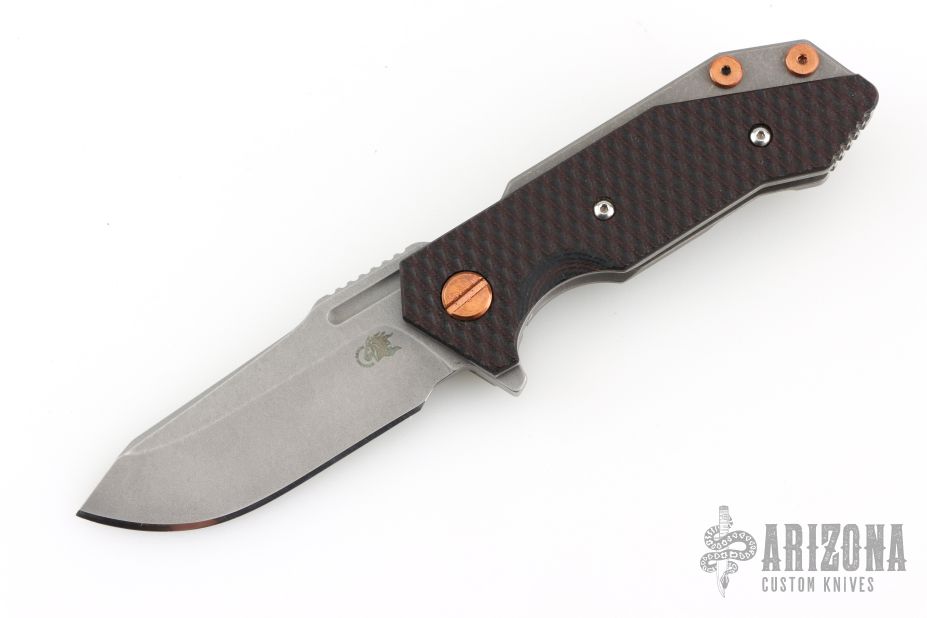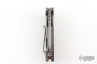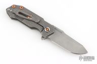 This Half Track from Hinderer Knives features a working finished blade with swedge, fullers, notched thumbrest and flipper. The handle has a working finished titanium frame with a black/burdundy scale. Titanium clip is positioned for tip up, right hand carry. Copper pivot, hardware, and over travel stop. Comes in original box. Has some scuffs and scratches, great overall condition.