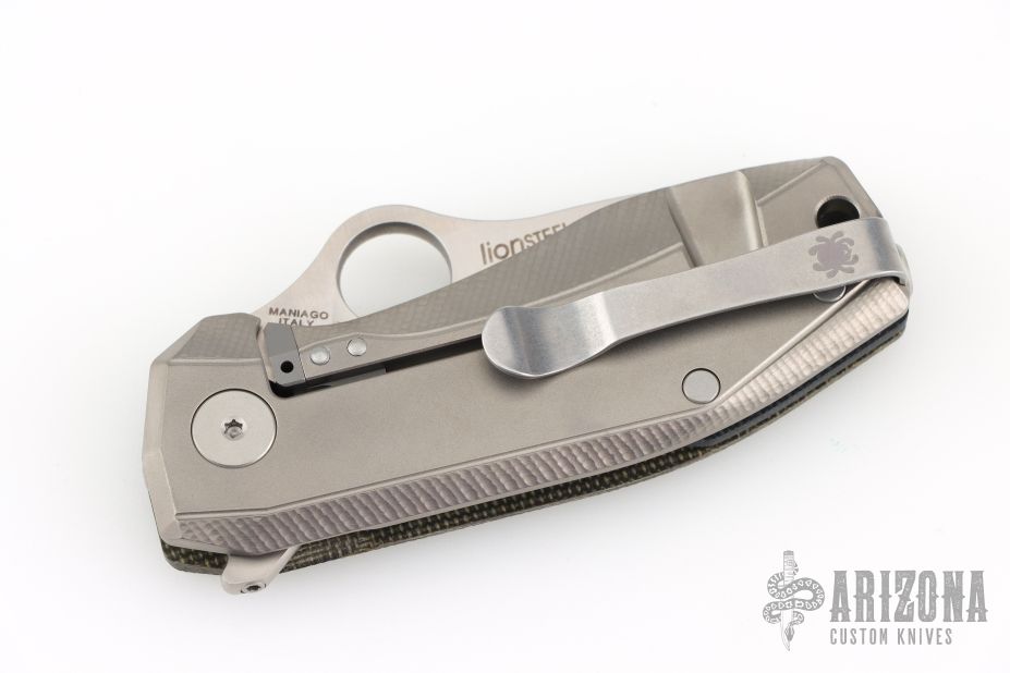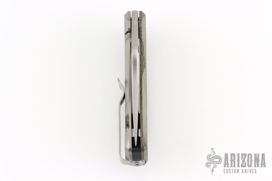 - Handle: Titanium handle with a green canvas micarta show scale.