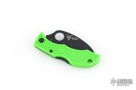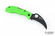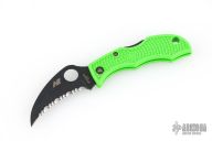 This Ladybug by Spyderco is a special limited edition for the USN. It features a black fully serrated blade with notched thumbrest and a thumbhole. The handle has a green FRN handle with black stainless steel backspacer. Comes with original box and papers. Excellent condition.