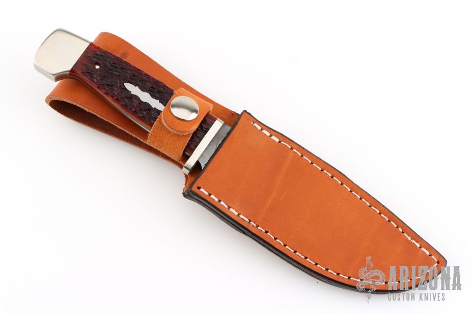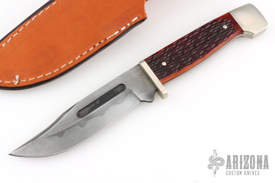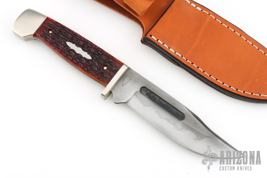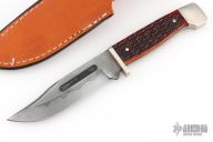 This Plainsman by Arrowhead Knifeworks is his take on a Case fixed blade. It features a satin finished blade with hamon, fullers and false top edge, .136" blade stock and 1.129" blade depth, full tang construction. The handle has a nickel silver guard and rear bolsters, jigged bone scales and nickel silver pins. Comes with a brown leather sheath, zippered case and COA dated January 2025. New from maker.