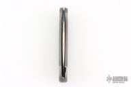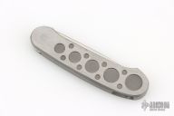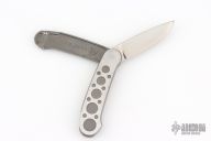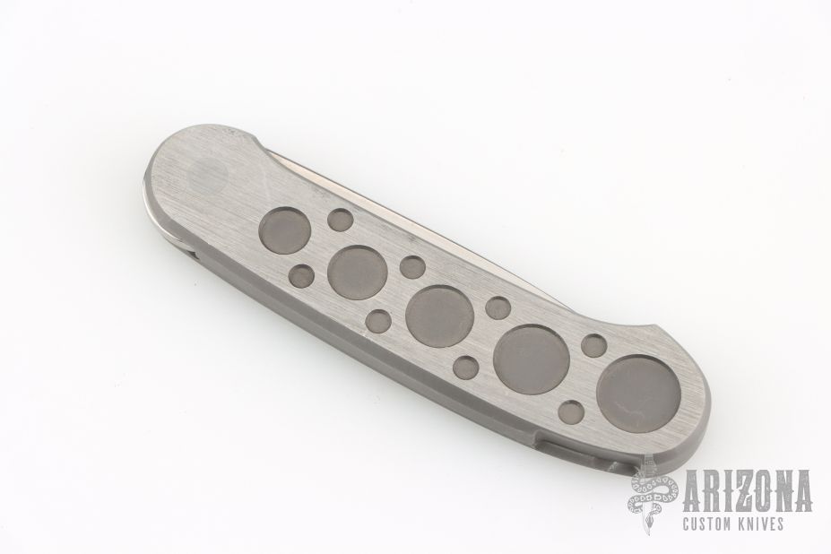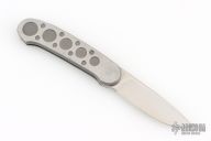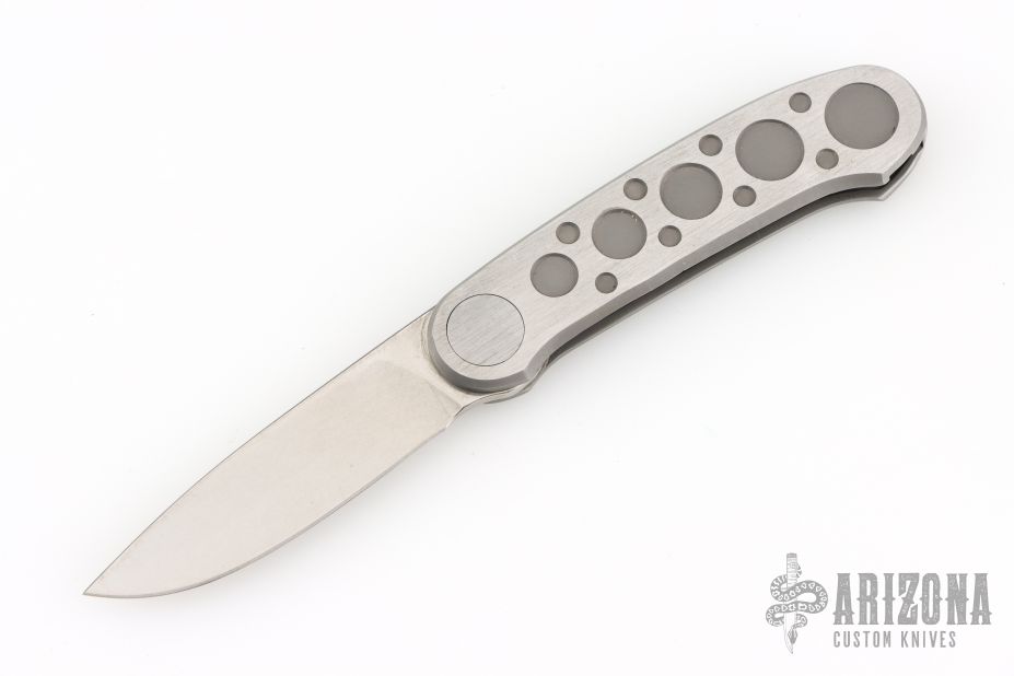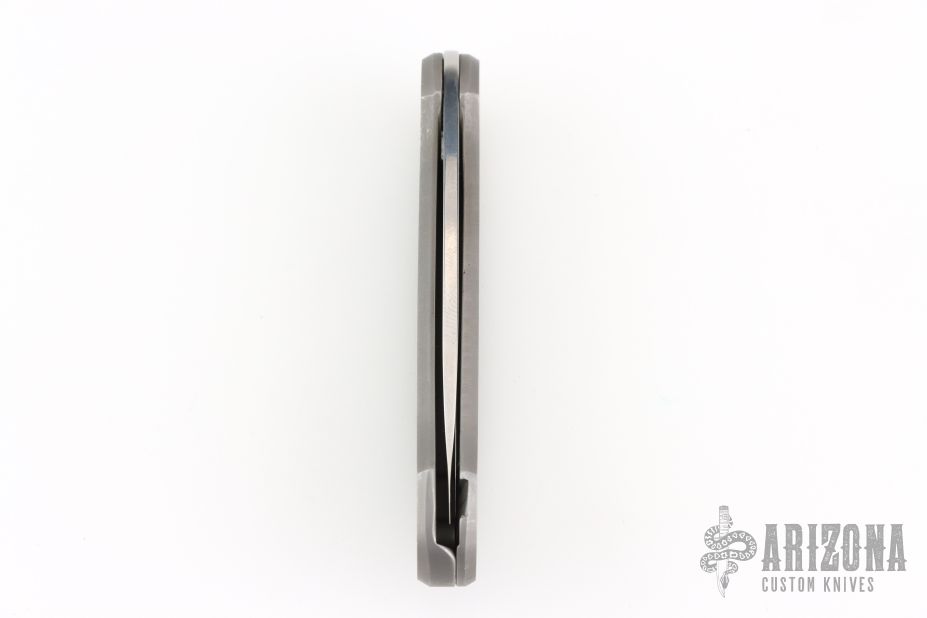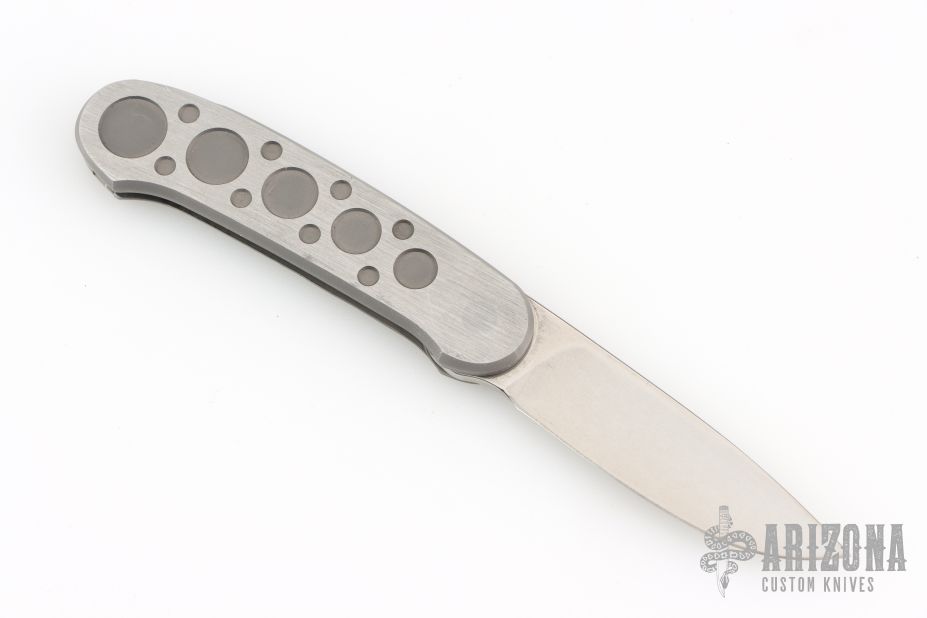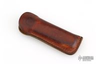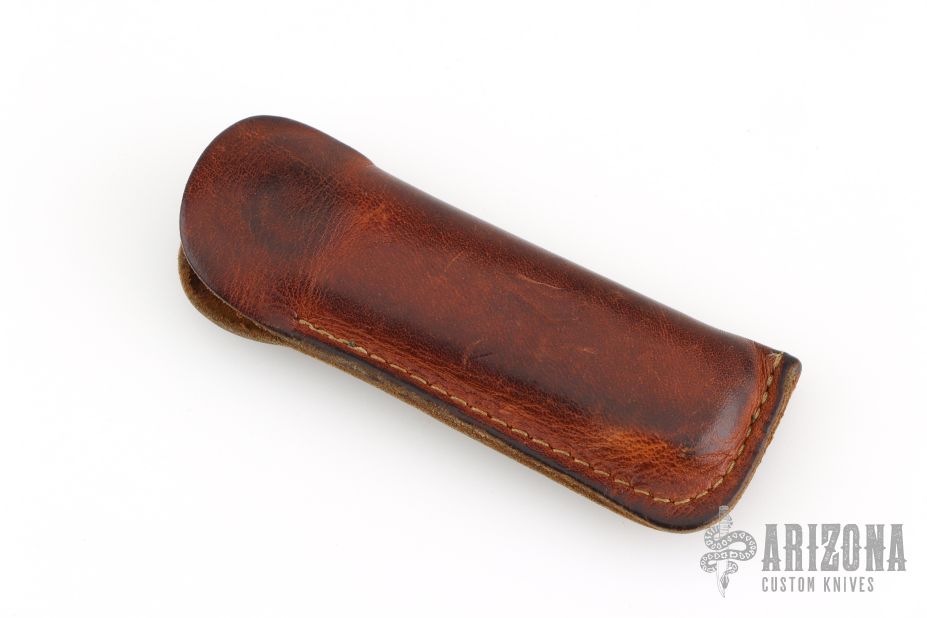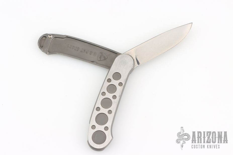 Barry Wood design for Pacific Cutlery. This is a unique scissor opening folder, which when the blade is fully open and locked in place is almost a fixed blade knife. Opening is accomplished by lighting pressing down and outward at the rear indentation on the spine, which releases the locking pin and allows one side of the handle and the blade to rotate down then forward until the blade locks in the forward position. The one side of the handle continues to rotate back until it locks in place. Closing requires the same slight thumb pressure at the indentation to release the locking pin, then the one side of the handle is rotated back and around, catching the blade and aligning both with the other side of the handle in a locked closed position. The handle features a steel construction. Comes in a leather pocket sheath. Has some scratches, otherwise good condition.