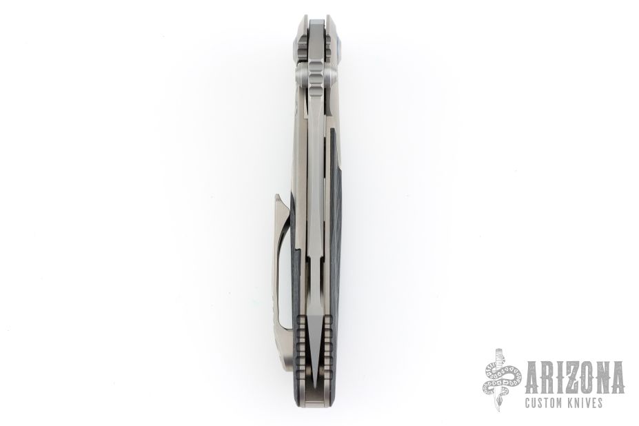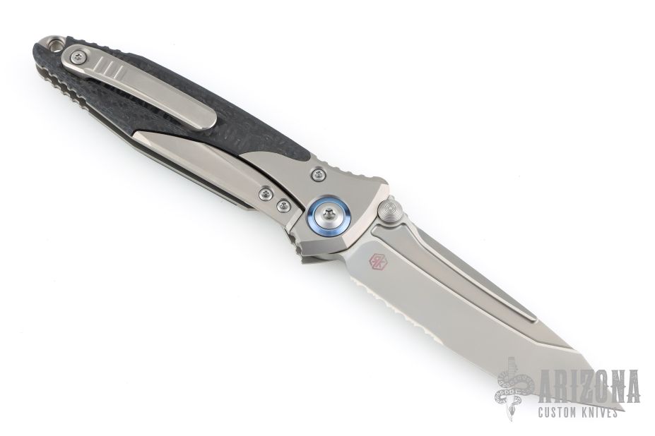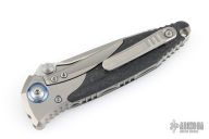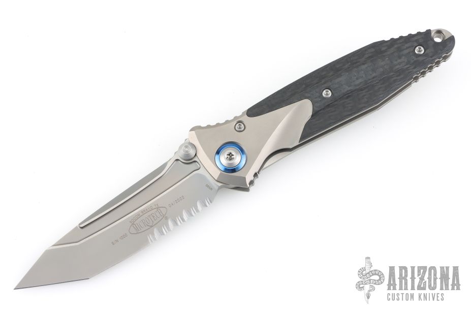 This Socom Bravo by Microtech is made in China by Rike Knife, it features a bead blasted partially serrated blade, notched thumbrest, and dual thumbstuds. The handle has bead blasted titanium bolsters/liners, bronze anodized pivot collars, carbon fiber scales. Tip up carry bead blasted titanium clip. Bead blasted titanium backspacer. Dated 04/2022 and s/n 1000. Comes with original box and papers. Excellent condition.