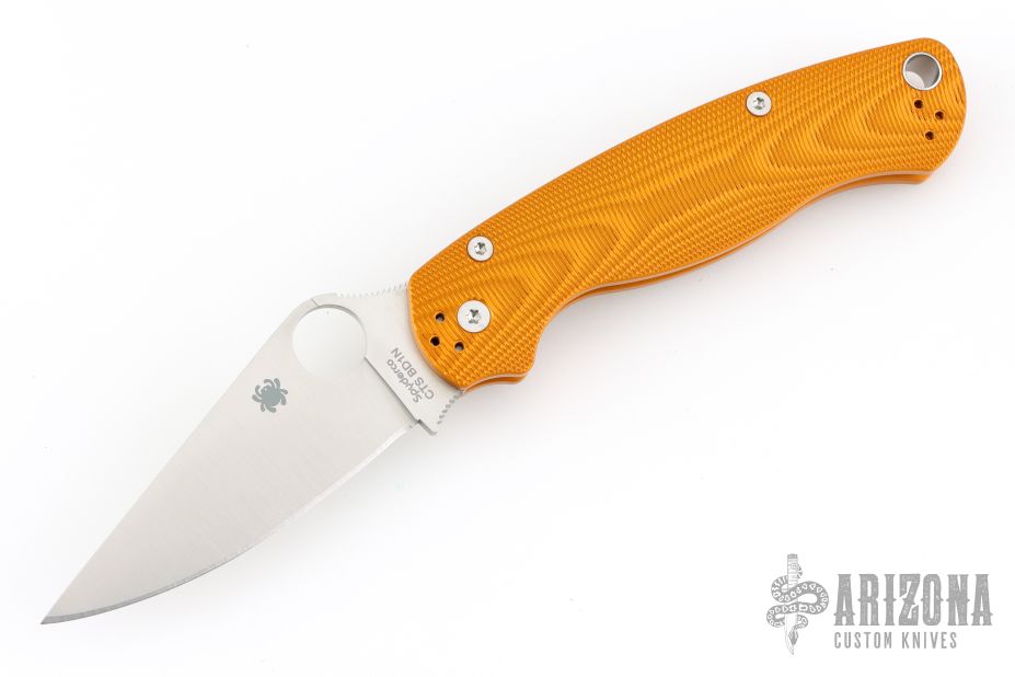 For many people, the PM2 is just about perfect. It would be easy for Spyderco to rest on its laurels, and continue to produce this icon of the knife industry as we all know it, but that's not the Spyderco way. Blade HQ and Spyderco have teamed up to take the Para 2 to the next level, with these anodized aluminum handle scales. Not only do they add a bit of strength, but because they negate the need for full steel liners, they make the knife a little bit lighter, too. We chose CTS BD1N blade steel, a very fine-grained steel that uses nitrogen to equally spread carbides, making for an incredibly sharp edge and good toughness.