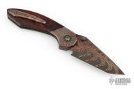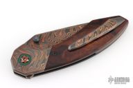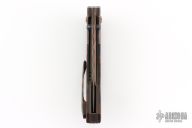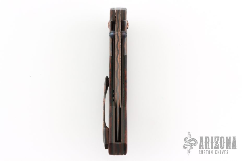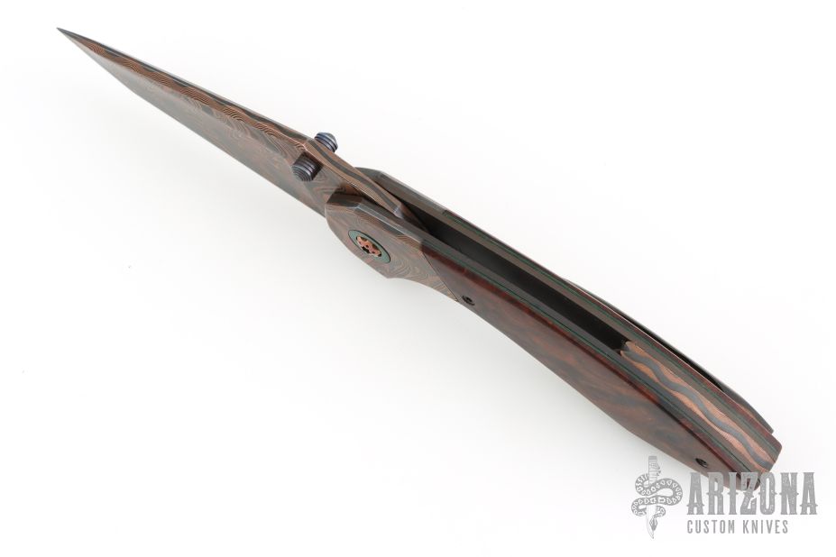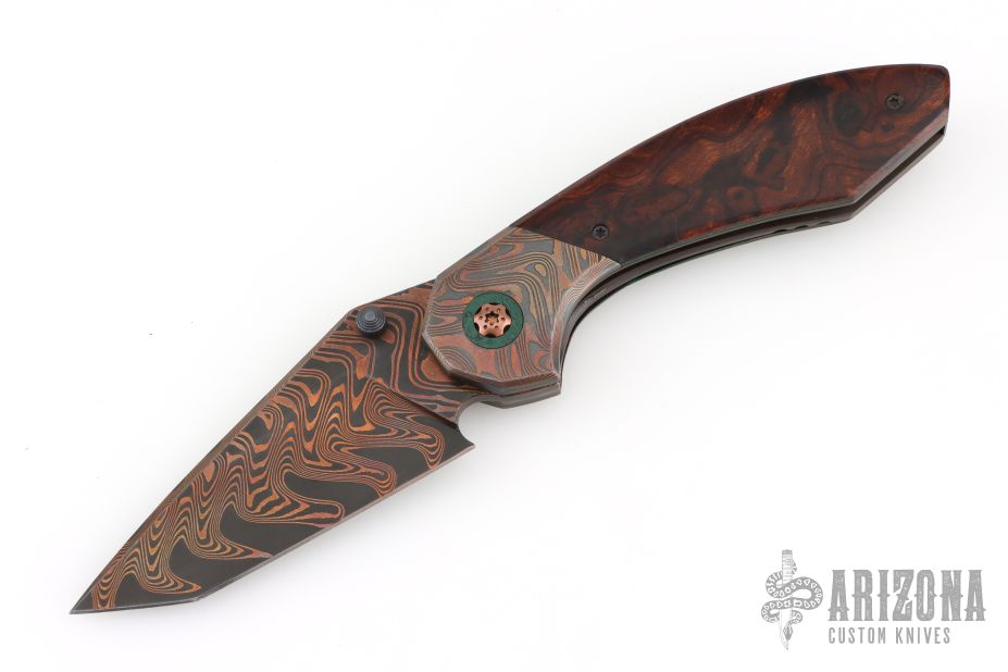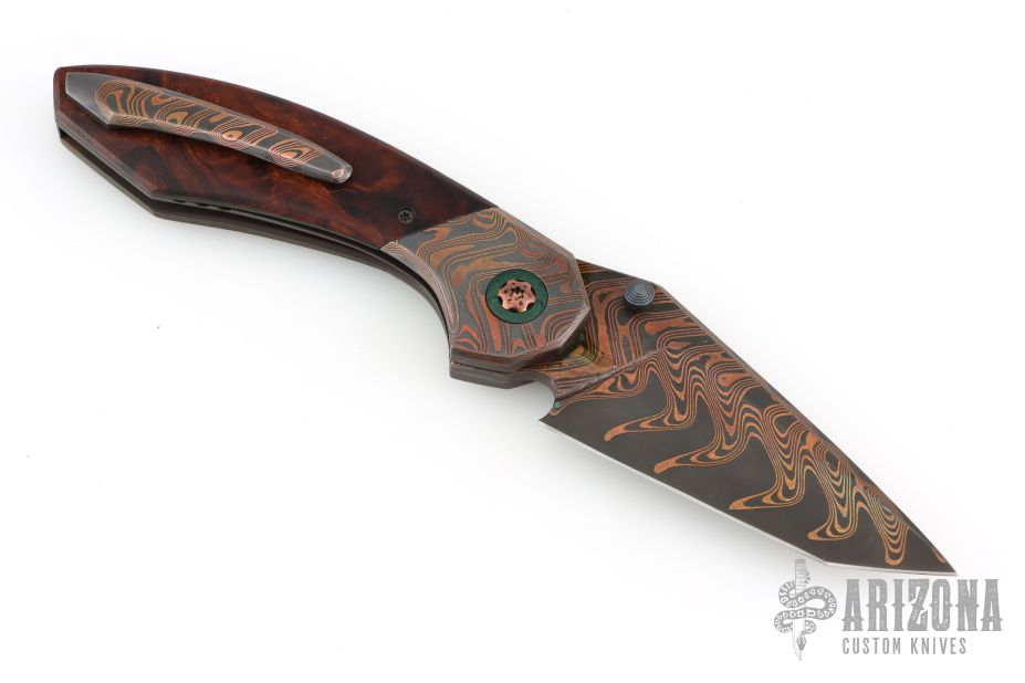 This Apex Flipper by Larevo Knives features a Chad Nichols CopperMascus blade, blackened titanium thumbstuds, notched flipper. The handle has CopperMascus bolsters, desert ironwood burl scales, blackened titanium liners, CopperMascus backspacer, blackened titanium hardware, copper pivot with emerald green micarta pivot collars, and tip up CopperMascus clip with hidden screws. Rides on Steve Skiffs dual row ceramic bearings, nice detent, lockup and blade seating. Comes with a zippered case and COA dated January 16, 2025. Excellent condition.
