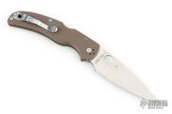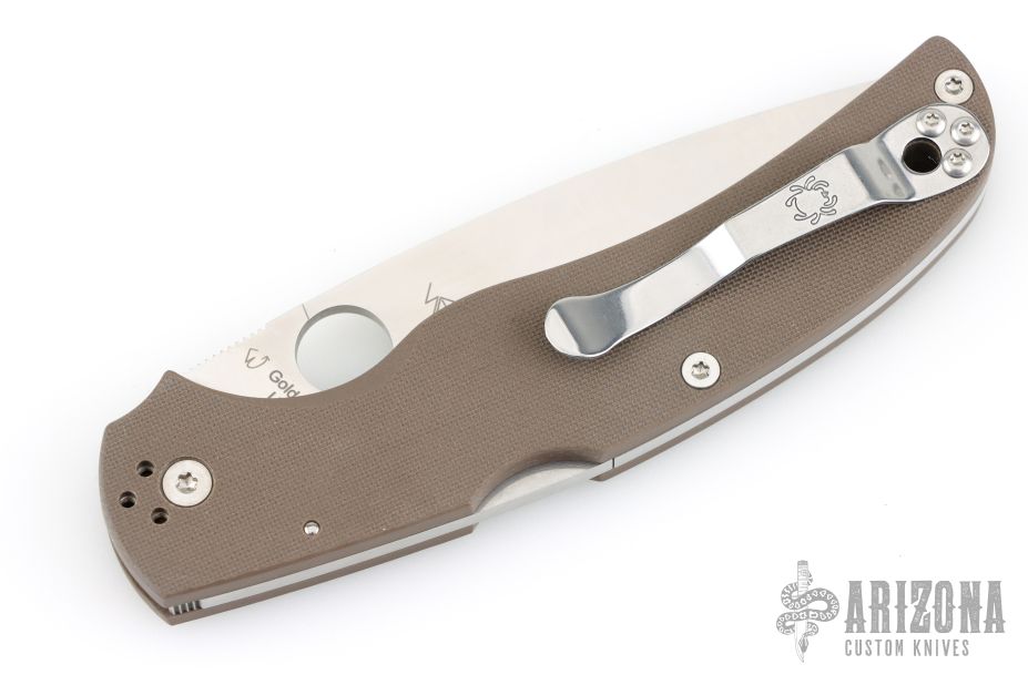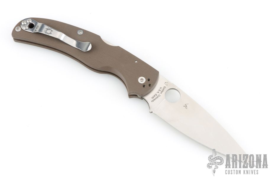 This Native Chief by Spyderco features a satin blade, brown G-10 scales, black stainless steel backspacer and 4-way reversible clip. Comes with original box and papers. Excellent Condition.